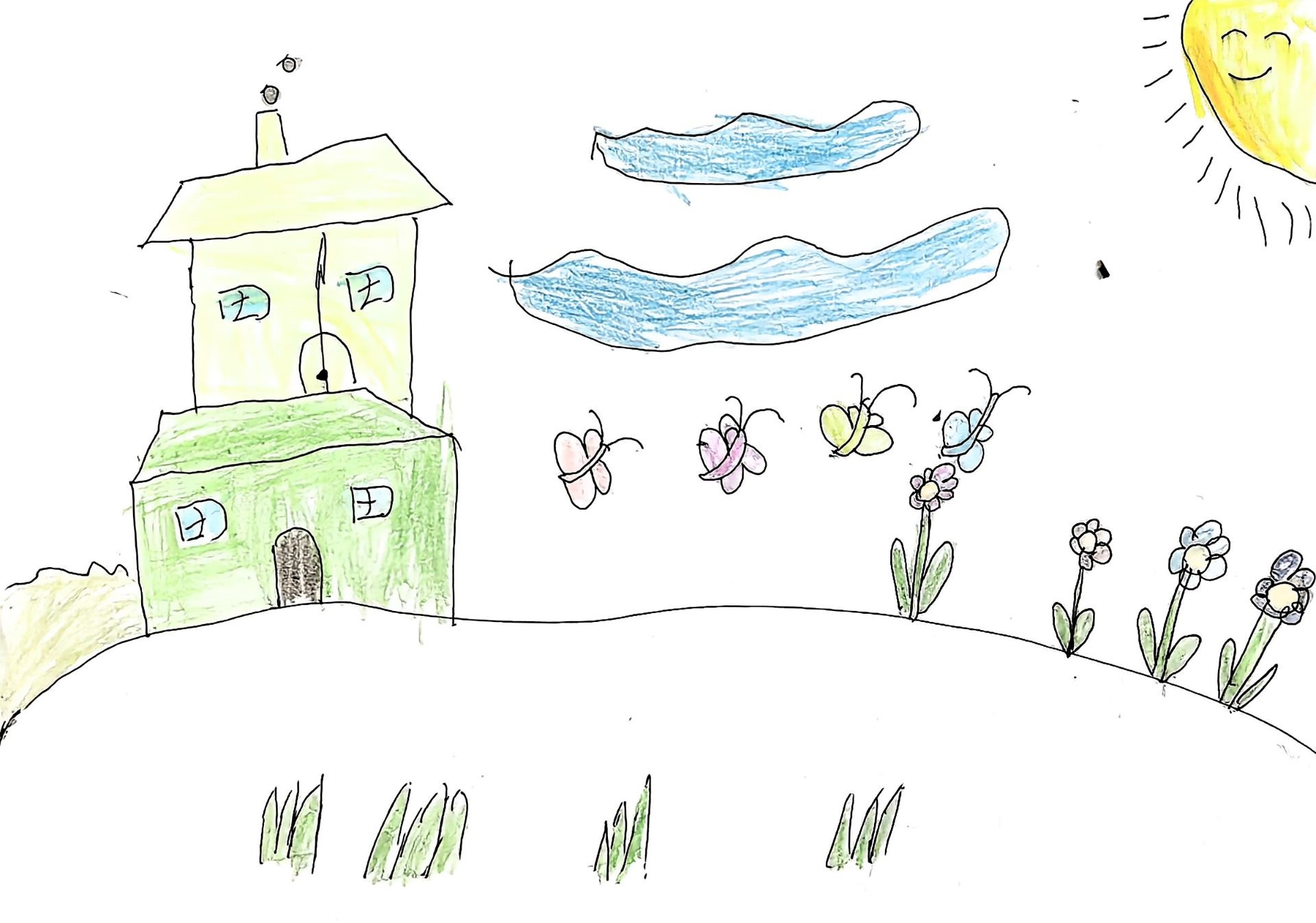 大家好!我画的是《山坡上的童话小屋》。你看,黄绿相间的小屋在山坡上,旁边有花儿、蝴蝶,还有笑眯眯的太阳和蓝蓝的云。这里就像童话里的家,每次想象住在这里都超开心。欢迎大家来山坡上的童话小屋,看看这些可爱的景色,保证你们会爱上这片充满童趣的小天地哦!