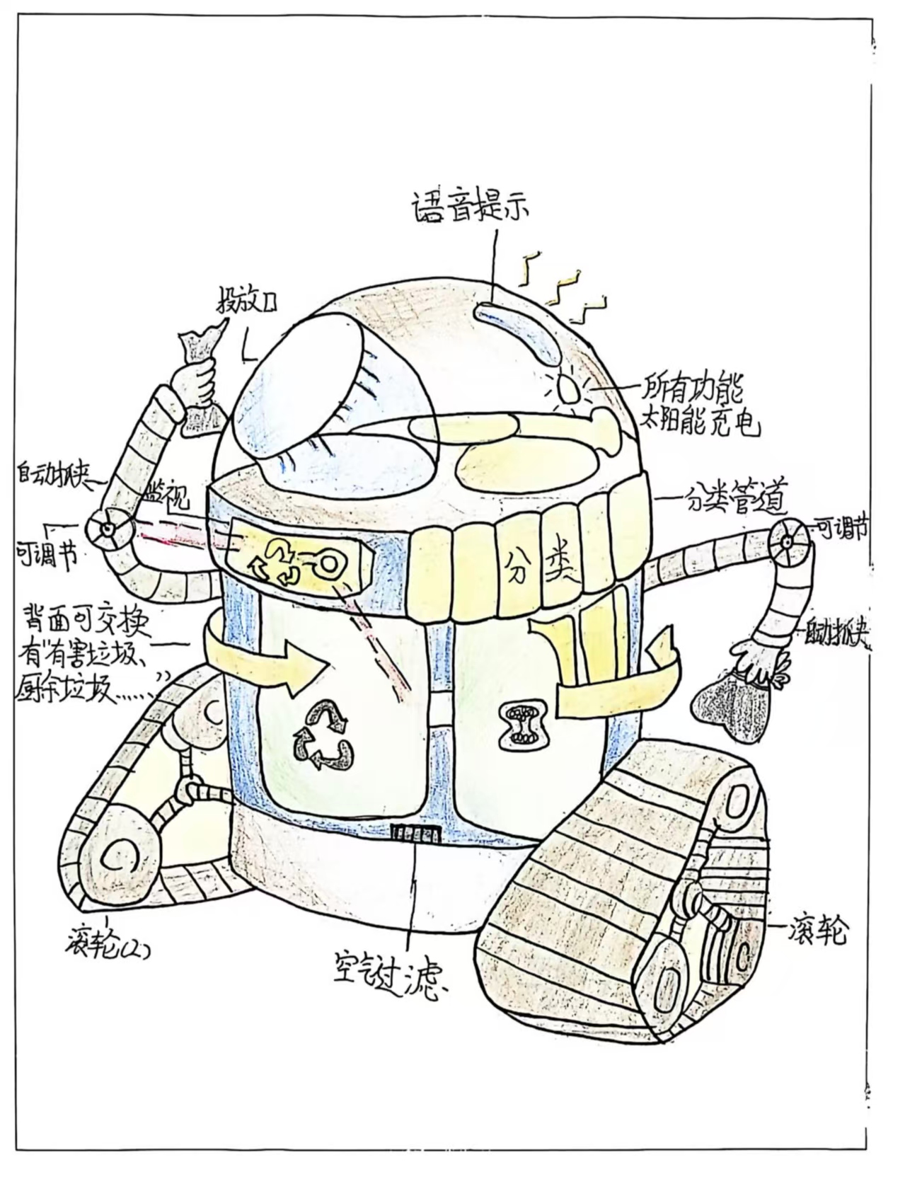 针对现实中垃圾分类投放不规范、混合投放污染环境、资源浪费等问题,我设计了这款智能分类垃圾箱。它具备自动清扫功能,可识别并收集周边散落垃圾,保持区域整洁;同时内置AI识别系统,能快速区分可回收物、厨余垃圾等不同类型,自动完成分类打包与压缩。无需人工干预,既解决了分类难、投放乱的痛点,又提升了资源回收效率,为打造清洁、环保的智能生活环境提供了新方案。