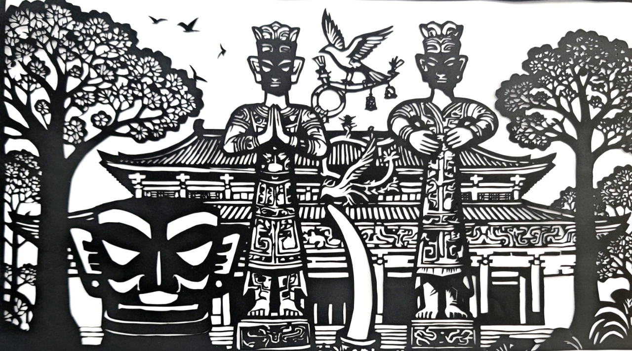 本幅作品以剪纸艺术为载体,呈现出四川三星堆古蜀文化的风貌。画面融合古蜀风格建筑、神秘的商铜纵目面具与青铜立人像,辅以青铜树、飞鸟等元素,在黑白对比间,展示古蜀文明的厚重与灵动,在纸上复刻古蜀大地曾经的璀璨与神韵,本作品将传统剪纸艺术与古蜀文化交融,为家乡传统文化的传播发声。