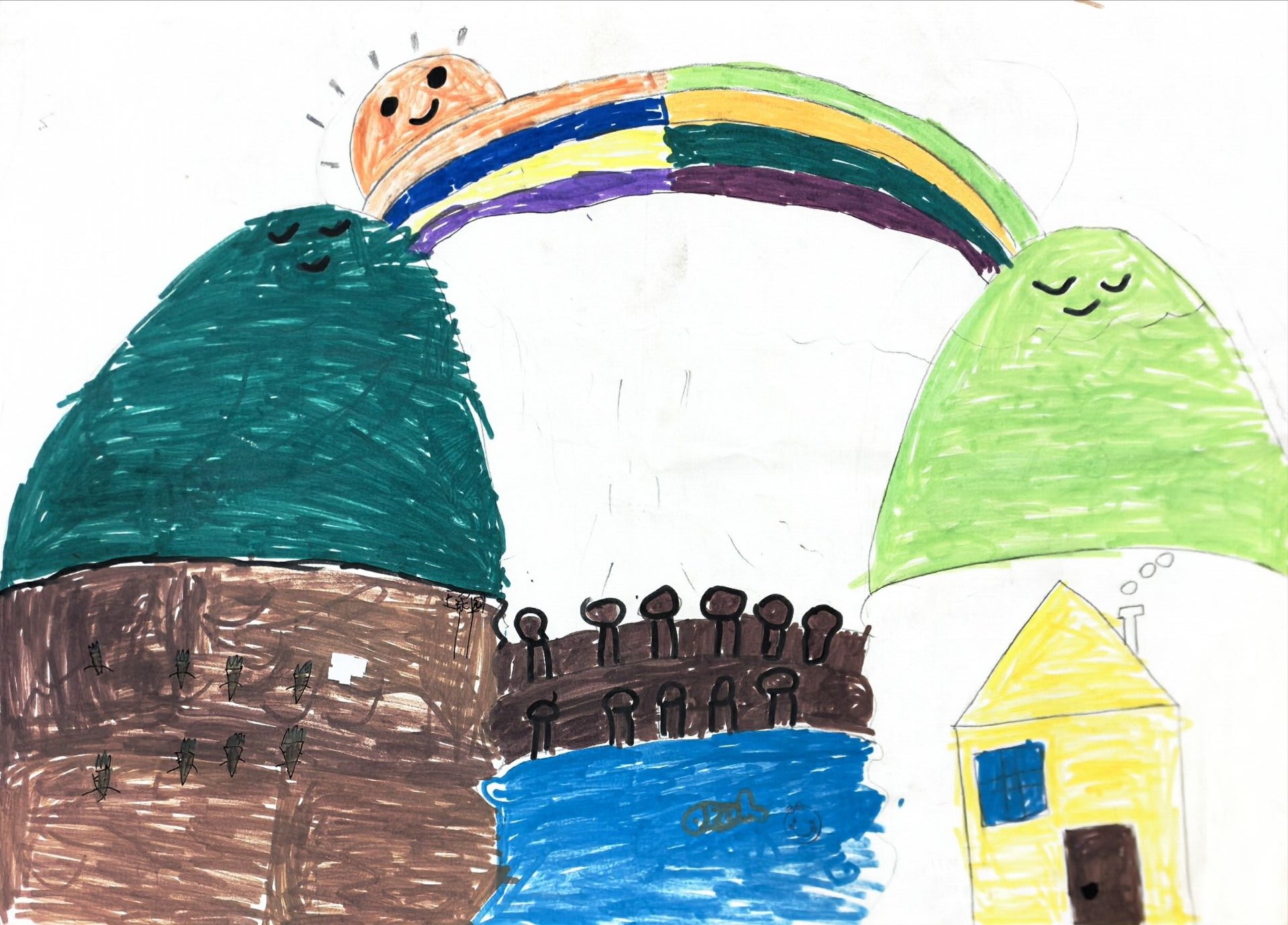 大家好!我画的是《彩虹山下的欢乐小镇》。你看,两座笑眯眯的大山之间有座彩虹桥,太阳也在笑呢。山下有小河、小桥,还有可爱的小房子。这里的人们每天都能看到彩虹,生活超快乐。每次想象住在这样的小镇里,就觉得特别幸福。欢迎大家来彩虹山下的欢乐小镇,看看这些萌萌的景色,保证你们会爱上这片充满欢笑的小天地哦!