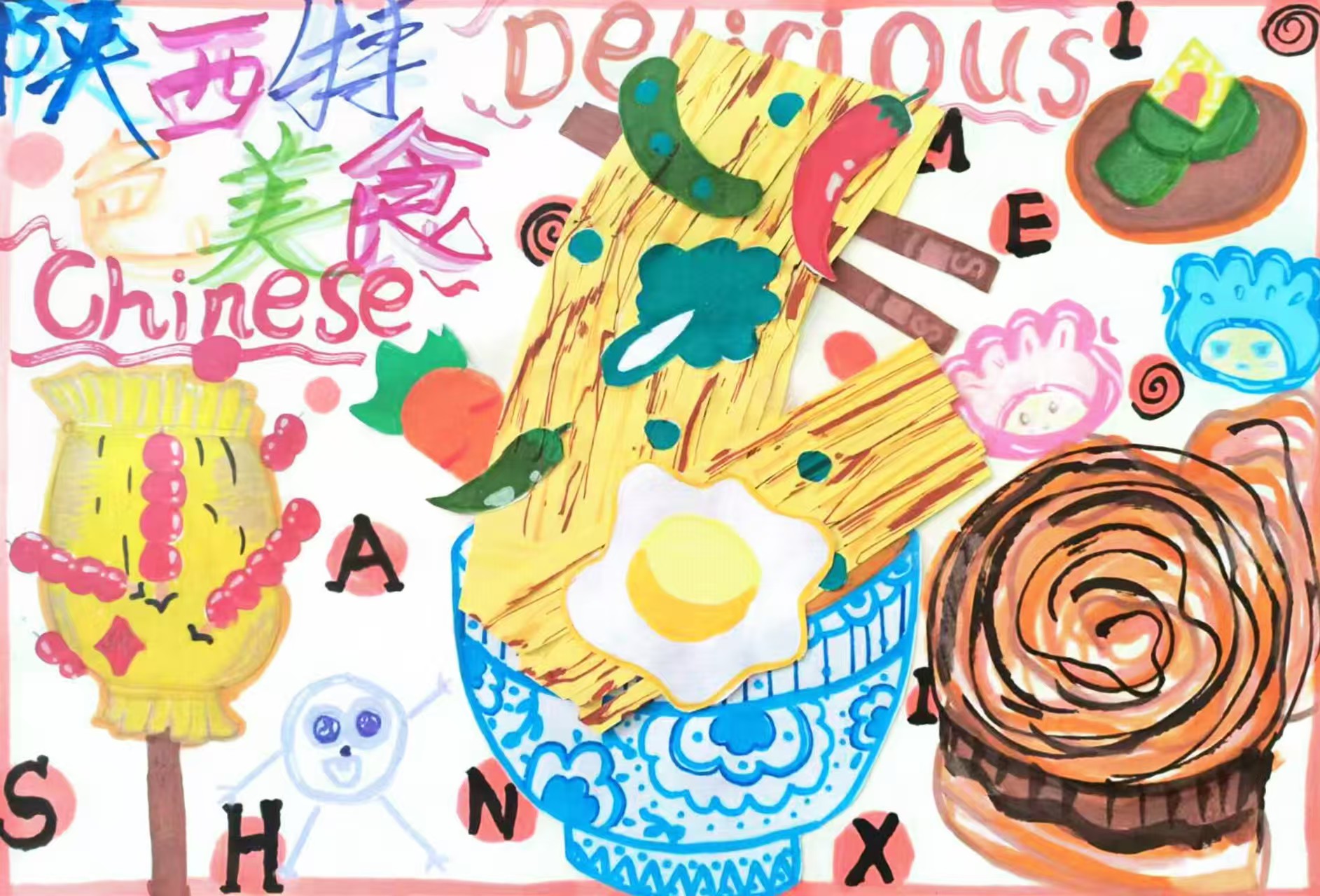 这幅画聚焦"陕西特色美食",以剪贴与手绘结合的形式,呈现油泼面、肉夹馍、糖葫芦等标志性美食:金黄面条配煎蛋、红绿辣椒显油泼面的鲜香,棕褐螺旋造型还原肉夹馍质感,黄筐串起的糖葫芦则添了甜意。多彩文字与卡通装饰点缀其间,既显陕食的丰富味型,也以活泼画风传递出美食的烟火趣味。
