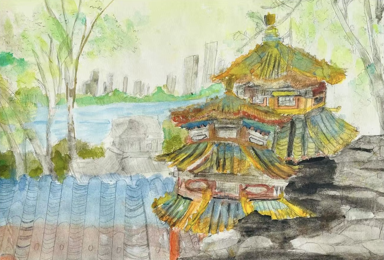 这幅《南湖风光》以水彩晕染出湖岸的灵秀:层檐叠翠的古亭攒尖顶覆着金黄绿瓦,朱红廊柱与飞翘檐角晕染出中式建筑的雅韵;近岸青瓦错落,远湖泛着淡蓝波光,更有现代楼宇隐于岸林之后。疏朗的树影轻笼画面,柔润的色调裹住亭台、湖光与城景,既绘出南湖古意盎然的园林风貌,也藏着古今相融的城市温柔,恰似一帧浸着水汽的江南春景。