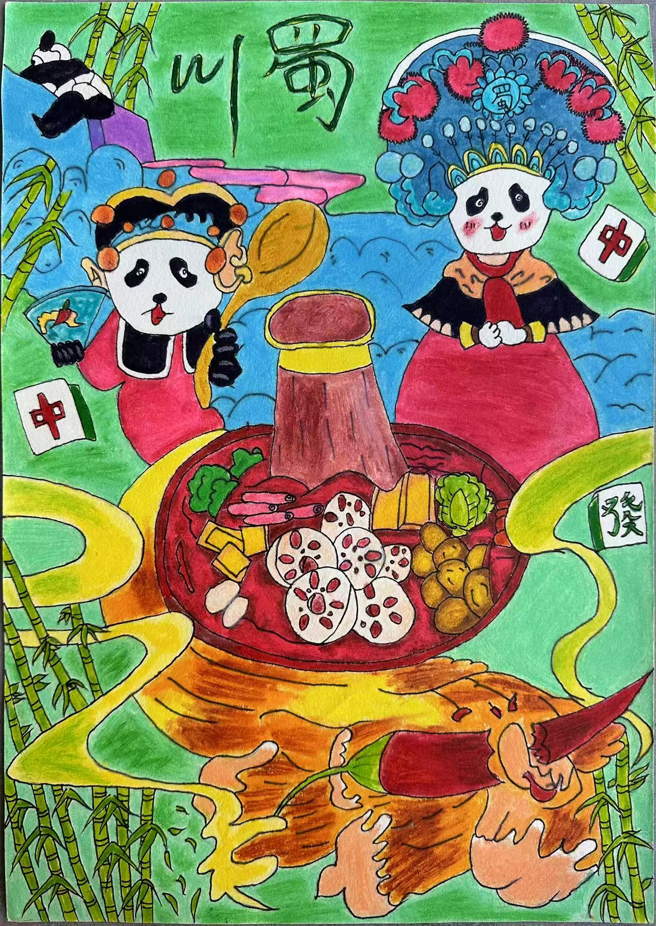 这幅画把巴中揉进川蜀烟火里:红油火锅裹着通江银耳的软糯,是"银耳之乡"的珍味落进川味热辣;熊猫扮上川剧妆,裹着巴中"川陕交界"的文化交融——既有蜀地的闲适,又有巴中山野的鲜活。"中"字麻将与竹影相映,藏着米仓古道的商脉余温,把巴中"山水裹川味,烟火融文脉"的灵秀,酿成了舌尖与眼底的双重欢喜。