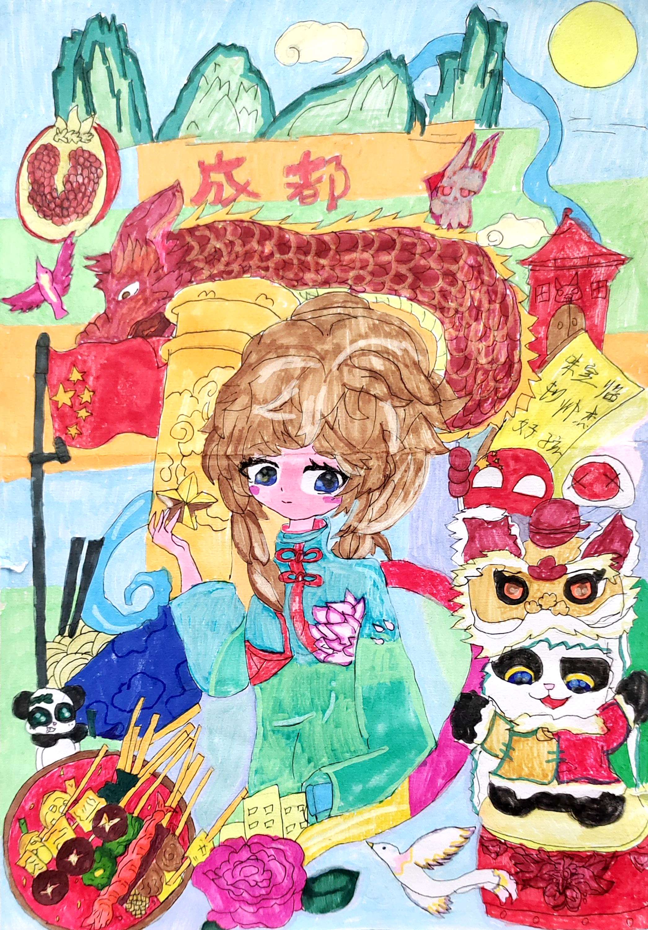 这幅画是成都的活力缩影。女孩身着特色服饰,身旁有憨态熊猫、醒狮,搭配串串、石榴等元素,还有巨龙、红旗彰显底蕴,山水、明月烘托氛围,把成都的美食、萌趣、传统与自然之美,融汇成一幅热闹鲜活的城市风情画,展现 "天府之国" 的独特魅力 。