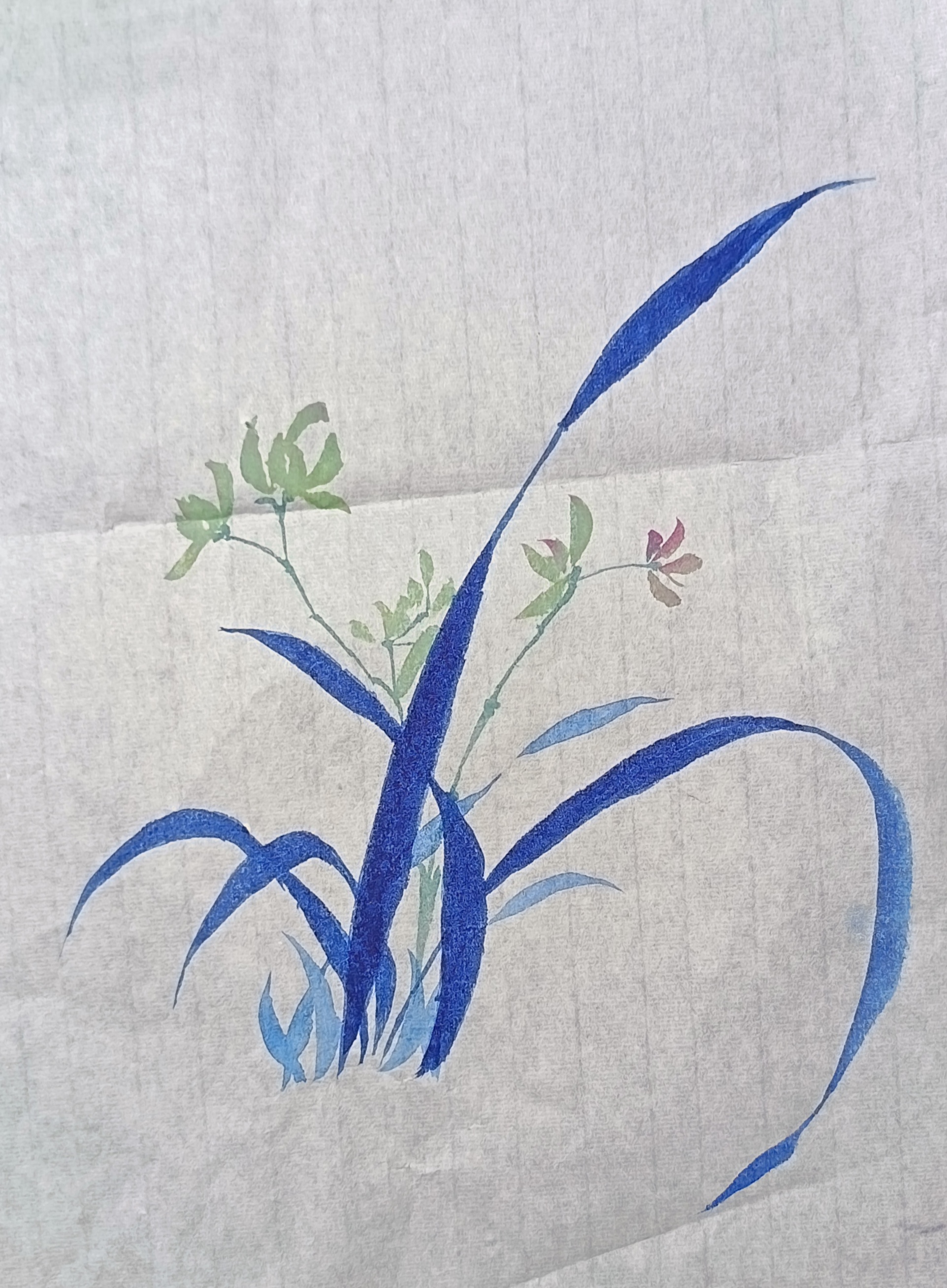 我的这幅作品,是用中国水墨画的形式进行创作的。在我的家乡有很多的兰花,当我见到他的第一眼,我就想到过要用笔,将他永远留在最美的时候。兰花,是一种传统的意象,用墨色,以沉静靛蓝绘兰叶,遵守"一笔长,两笔短"的笔墨韵律,有着清冷松弛的气势,浅绿花簇轻做点缀,描绘出蓝的幽隐之态,舒展的蓝叶,是从中生长出的诗意,这让古雅的文人落进当代人的情绪里,既舒展又温柔,兰如君子,拥有着坚韧不拔的毅力,我喜爱兰花,也会学习兰花的品质和精神。