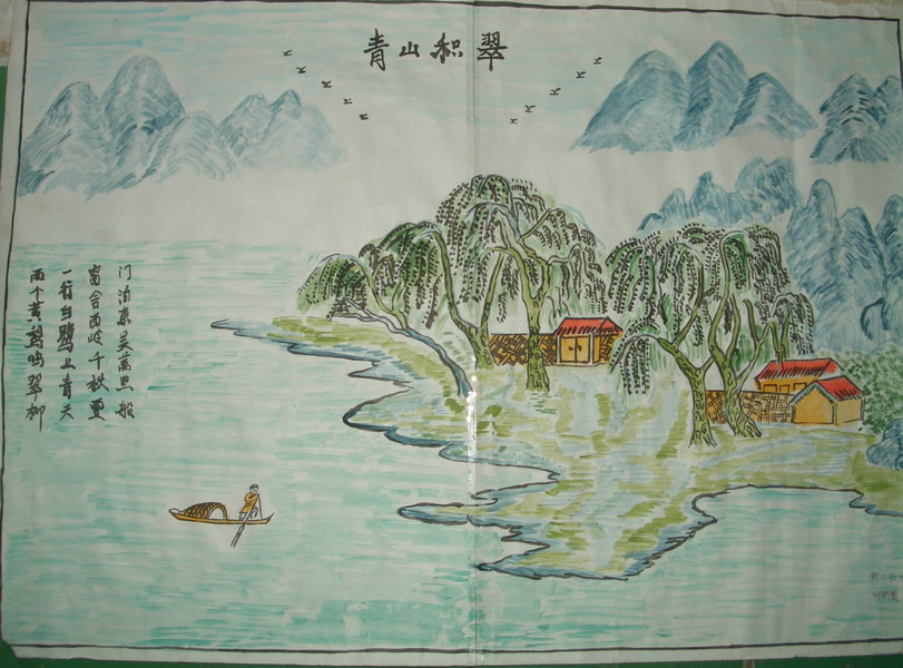 这是一幅山水画 ,它里面饱含的内容太丰富了。看!里面的山青青的,看起来真是让人陶醉不已,一个清晨鱼民在独自摇着独木舟,远处坐落着几处农家,柳树也是青青的。啊!太漂亮了。