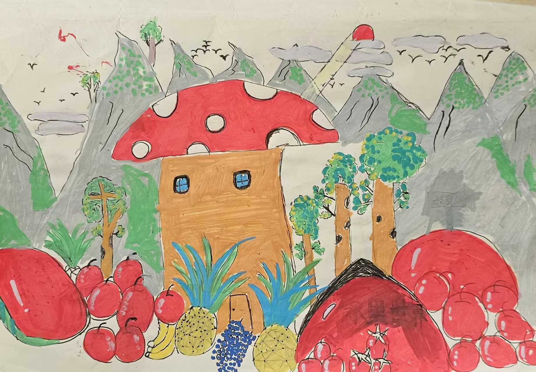 以明快色彩描绘了一座山间的蘑菇形房屋,橙黄屋身与红点屋顶相映成趣,门前遍布西瓜、苹果、香蕉等水果,象征自然丰饶。背景青灰色山脉点缀绿植,天空中小鸟飞翔,构图饱满充满童趣。作品围绕生态保护主题,展现人与自然和谐共生的理想图景,倡导珍惜环境、绿色生活,既是地方特色的艺术表达,也可作为观光旅游中弘扬环保理念的生动教材,激发对可持续未来的向往。