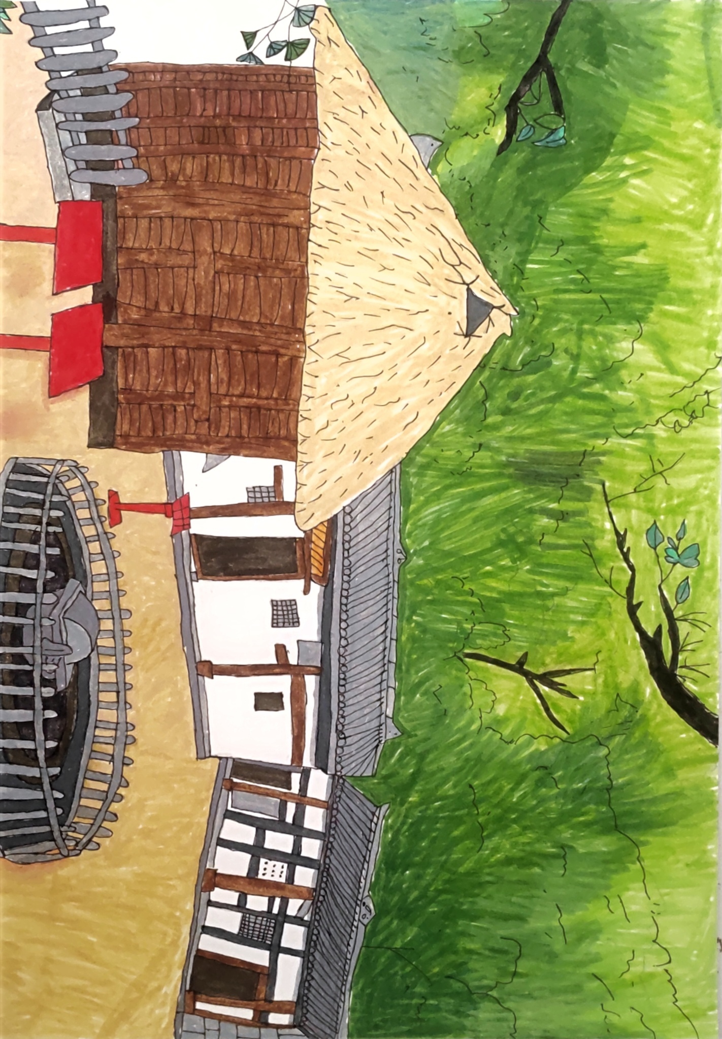 这幅画以朱德同志的乡土根脉为创作内核,将川北村落风貌与纪念馆精神意象相融:画面里白墙灰瓦的民居、竹编斗笠状草顶,暗合朱德故居的川北建筑肌理;水车与红色农具,呼应他早年耕读、心系农人的岁月底色。 我以倾斜视角重构空间,让乡土器物与建筑共生,既还原朱德同志"从田垄走向革命"的人生起点,也借舒展的乡野绿意,传递他"与人民共呼吸"的初心。这幅画是对元帅乡土情怀的具象化,让纪念馆的精神底色,在烟火气里更鲜活可感。