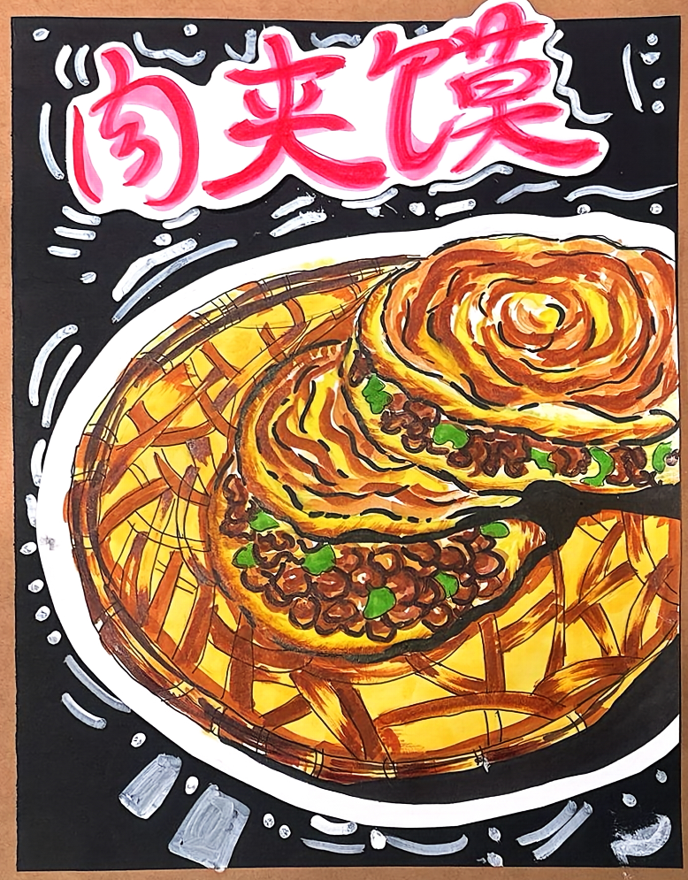 这幅画聚焦陕西"国民小吃"肉夹馍——焦脆起酥的馍皮裹着油润肉酱,金黄纹理衬出刚出锅的热乎劲儿,藏着西安街头的烟火魂。在陕西,外酥里软的白吉馍夹满卤香肉馅,是从小吃到大的爽快滋味,这幅画用鲜亮笔触,把这份刻在老陕味觉里的美味,画成了看得见的解馋烟火。