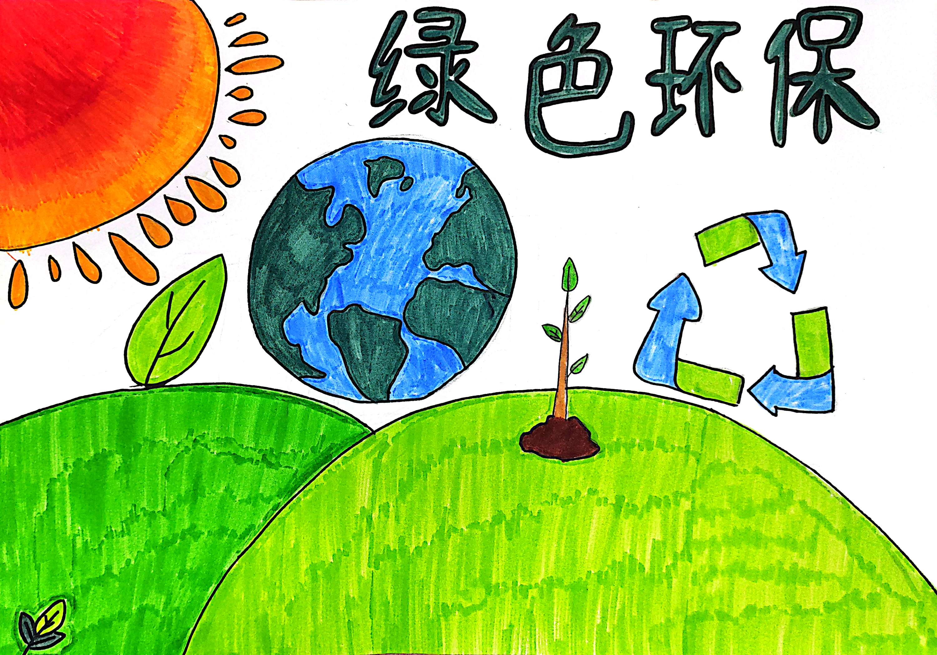 名称:《共护绿色地球》 这幅画以 "绿色环保" 为主题,用太阳、地球、绿叶、幼苗、循环箭头等元素,传递守护生态的理念。鲜亮色彩勾勒出美好自然愿景,呼吁人们践行环保,从日常点滴做起,让地球永葆生机,共筑绿色家园,凝聚对可持续未来的期盼 。