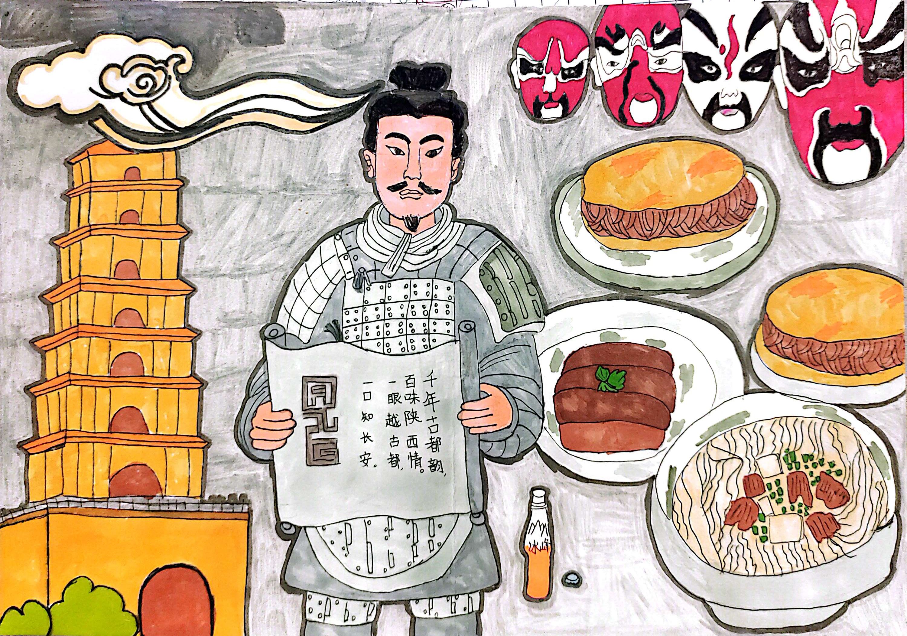 名称:《长安古韵食光》 这幅画是长安文化的生动拼图。兵马俑化身"代言人",手持卷轴诉说"千年古都韵,百味陕西情",大雁塔、秦腔脸谱彰显历史厚重,肉夹馍、面食等美食尽显烟火温度。创作者以童趣笔触,串联长安的历史符号与生活滋味,让古老与鲜活交融,带你一口"尝"尽长安的古韵与温情 。