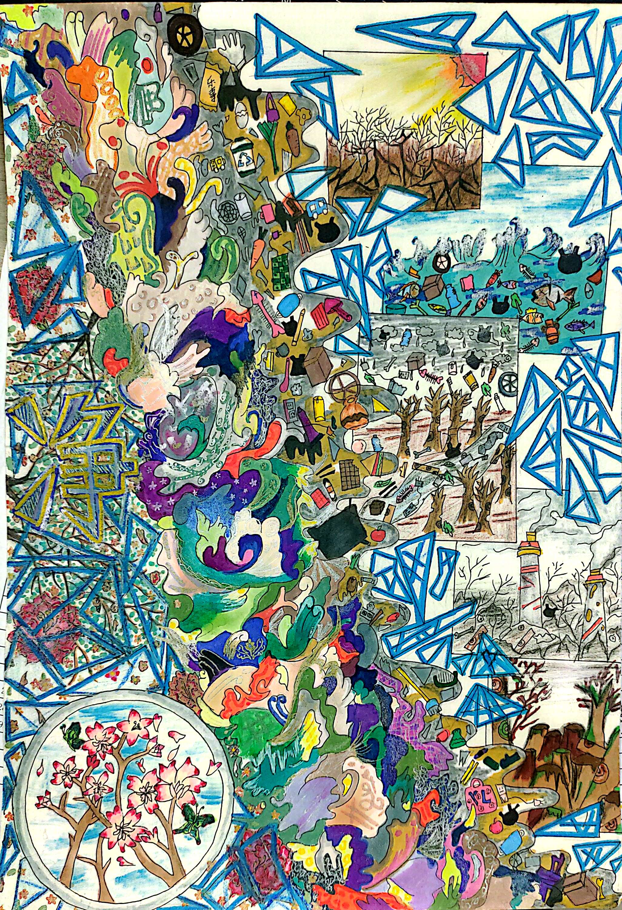 名称 《破碎边界:污染与生机的博弈》 简介 这幅画以破碎的蓝色几何图形为边界,分割出污染与生机的对立世界。左侧是色彩繁杂的污染洪流,各类垃圾、废弃品肆意交融,象征生态被破坏的混乱;右侧则呈现荒芜的自然景象,枯树、浊浪、残败建筑,尽显环境恶化后的死寂。而画面角落那几枝盛放的繁花、小片纯净水域,如微弱却执着的希望,在破碎边界间,警示人们关注生态危机,也传递对恢复生机的期许 。