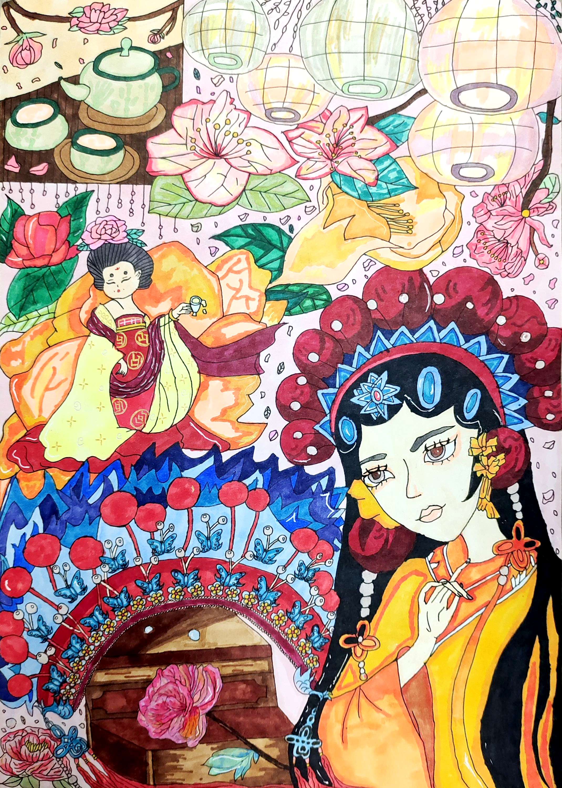名称:《繁花仕女绘》 这幅画满溢古典雅韵,以丰富元素勾勒东方意境。仕女服饰华美,色彩碰撞间尽显古韵,背景花灯、茶具、繁花点缀,营造出雅致的中式氛围。创作者借细腻笔触,将传统元素融合,展现对古典文化的热爱,每一处图案都似在诉说往昔故事,让观者沉浸式感受东方美学的温婉与绮丽,重拾古典文化里的浪漫情致 。