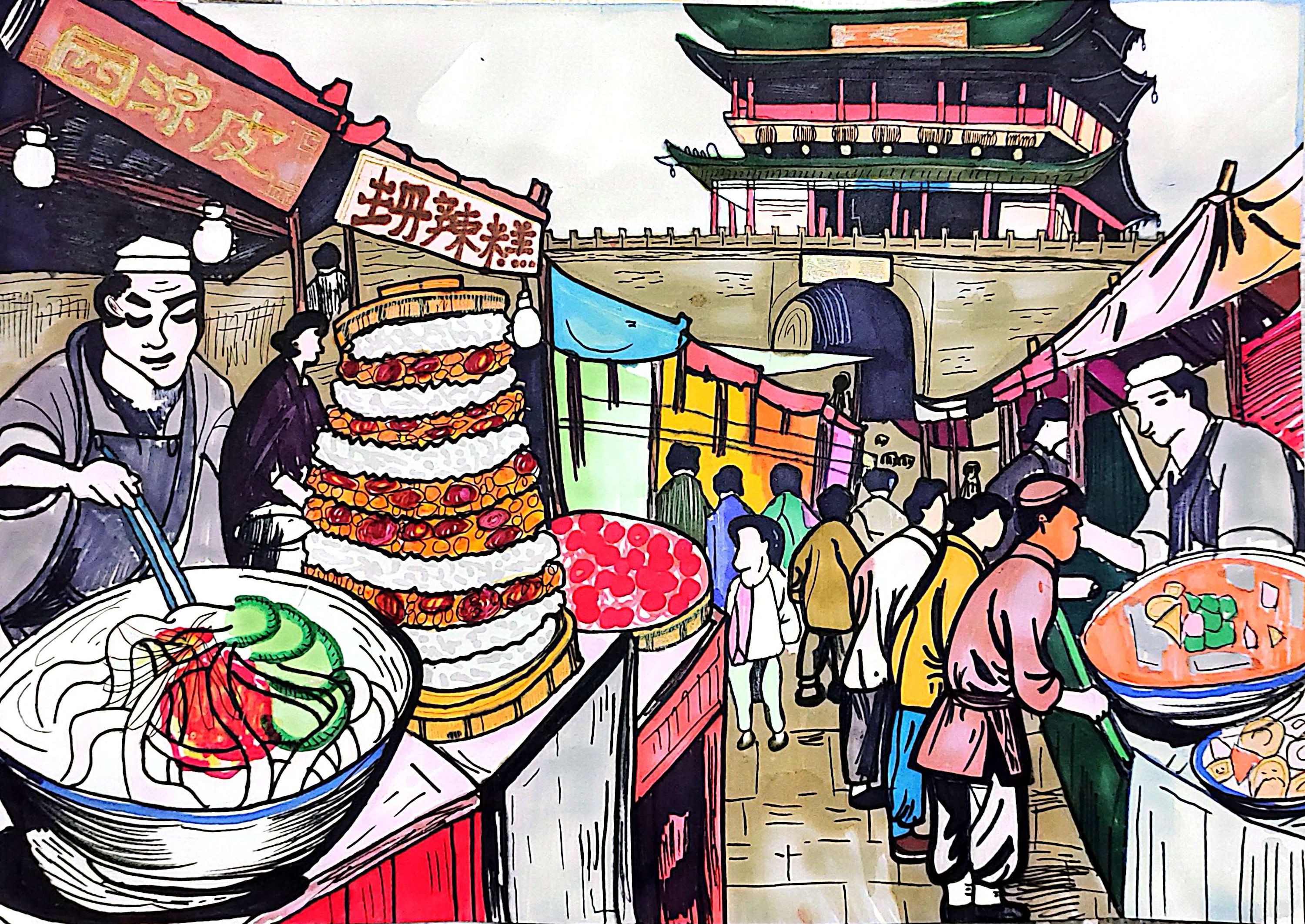 名字:《古邑食光集》 这幅画生动还原古邑街市盛景。传统建筑为背景,摊位林立,"四凉皮"辣糕" 等招牌醒目,堆叠的糕点、鲜润蔬果、彩丝凉皮,尽显美食丰盛。人物穿梭其间,有忙碌摊主、驻足食客,鲜活呈现市井烟火。借复古笔触,串联起古邑建筑与传统美食,让历史韵味与生活气息交融,宛如打开一卷记录往昔热闹食街的时光绘本,传递对传统市井文化的珍视与怀念 。
