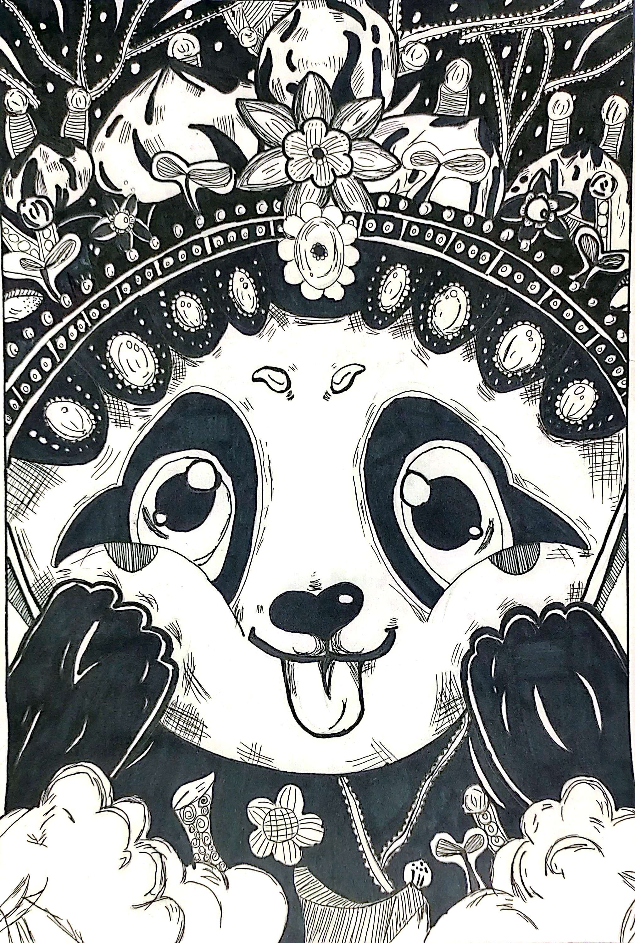 名字:《戏韵熊猫》 这幅作品以熊猫为主角,融入戏曲元素。熊猫头戴华丽戏冠,眉眼间藏着灵动俏皮,吐舌神态添几分憨趣。黑白线条勾勒出传统与萌趣交融的奇妙世界,借戏曲头饰的精致,展现独特创意,让国宝熊猫与戏曲文化碰撞,传递出古典与可爱并存的艺术氛围 。