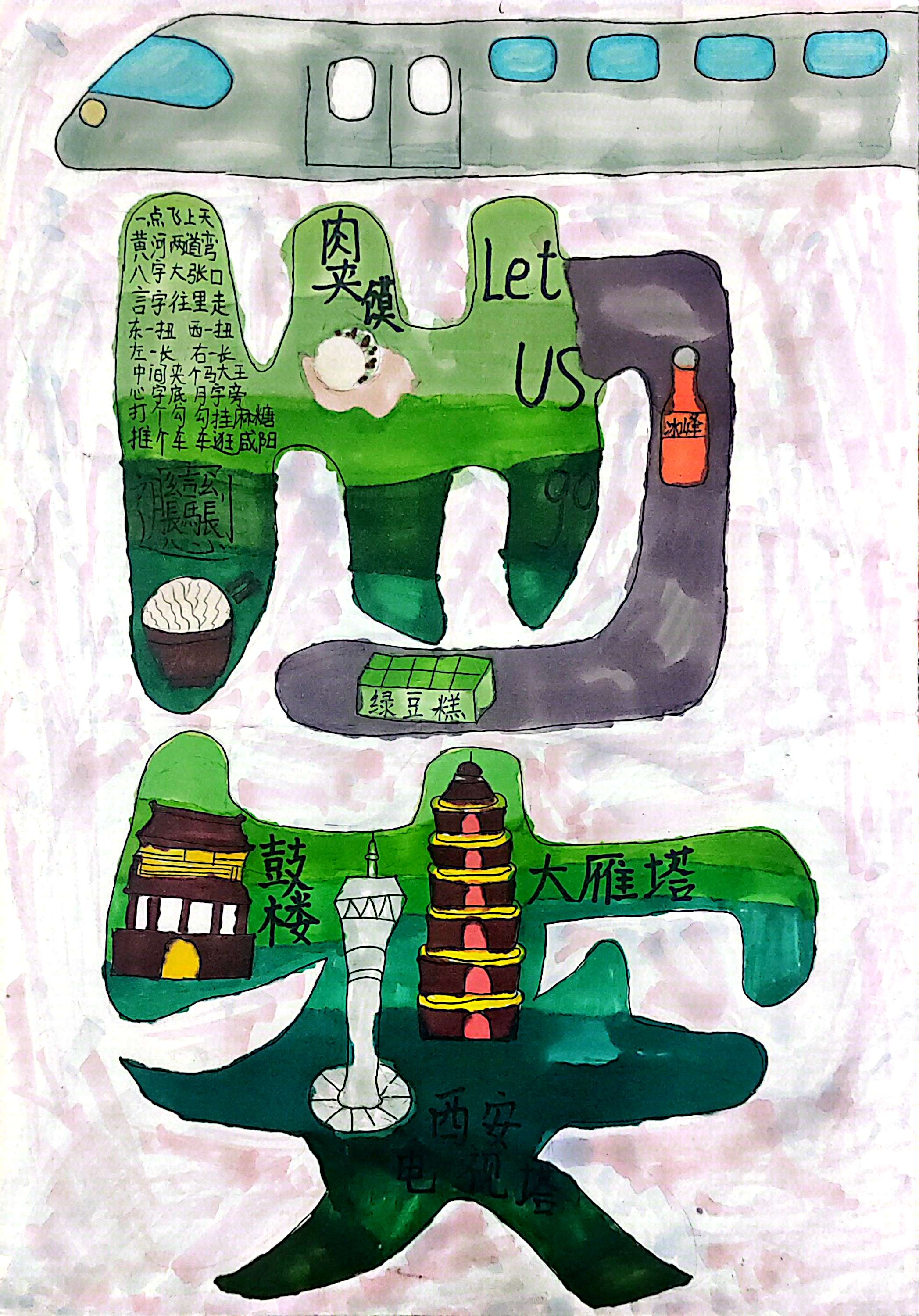 名字:《字绘西安》 这幅画以 "西安" 二字为框架,融入肉夹馍、冰峰等美食,鼓楼、大雁塔等建筑,还有趣味字谜。用多彩笔触,将城市地标、特色风味与文字创意结合,生动展现西安的美食魅力、历史底蕴,是一幅充满童真与巧思的城市印象绘,传递对西安的热爱 。