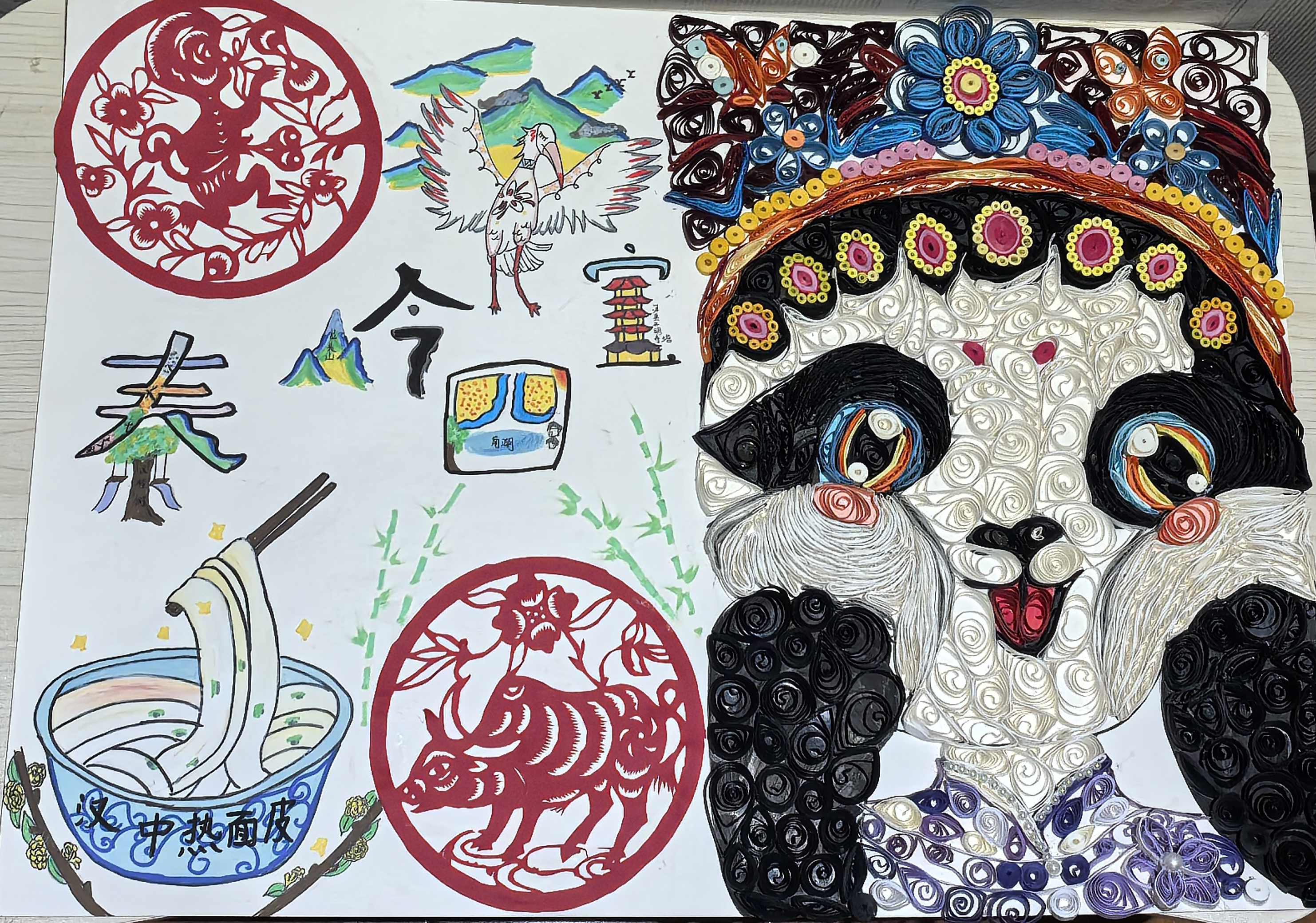作品以秦岭四宝为主,大体用衍纸做出熊猫,熊猫不仅是秦岭四宝中的一员还是中国的国宝并与衍纸结合熊猫头上戴着一顶凤冠,优雅中透露着活泼,用中国非遗剪纸刻画金丝猴和羚牛,使金丝猴羚牛秦岭两宝与中国传统文化特色相结合,强化了秦岭特色,用彩笔手绘朱鹮颜色鲜明,正符合朱鹮的傲然以及一些汉中美食特色,作品整体既凸显了秦巴山脉孕育的生态灵韵,又融入了汉中烟火的气息,使作品灵动并富有生命力