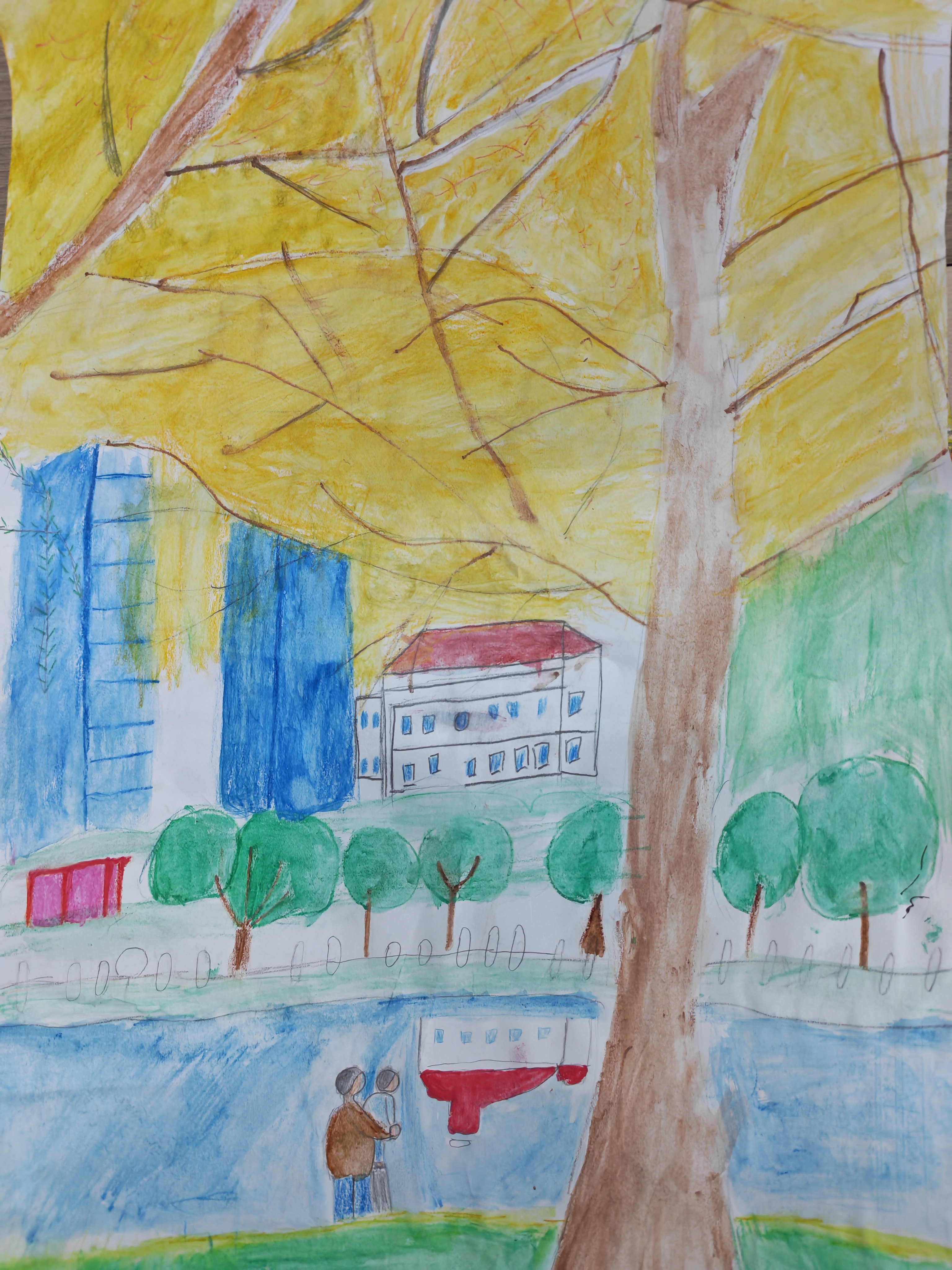 大家好!这是我画的汉中汉江边的风景呀! 你看蓝蓝的一大片就是汉江,水清清的,夏天站在岸边都能感觉到凉快!江面上那些弯弯的线,是风吹起来的小波浪,像妈妈织毛衣的毛线团滚来滚去~ 江边的绿草地是我常和小伙伴跑着玩的地方,草长得软软的,坐在上面能看见江里的小鱼跳起来!红顶顶的小房子是江边的农家乐,妈妈总带我去那儿吃饭,香得很! 黄黄的树叶是银杏树,秋天是他最美的季节。亮亮的颜色更能凸显出江边的魅力,在这里生活的人们每天都是幸福又快乐,所以我要将这份快乐画下来。