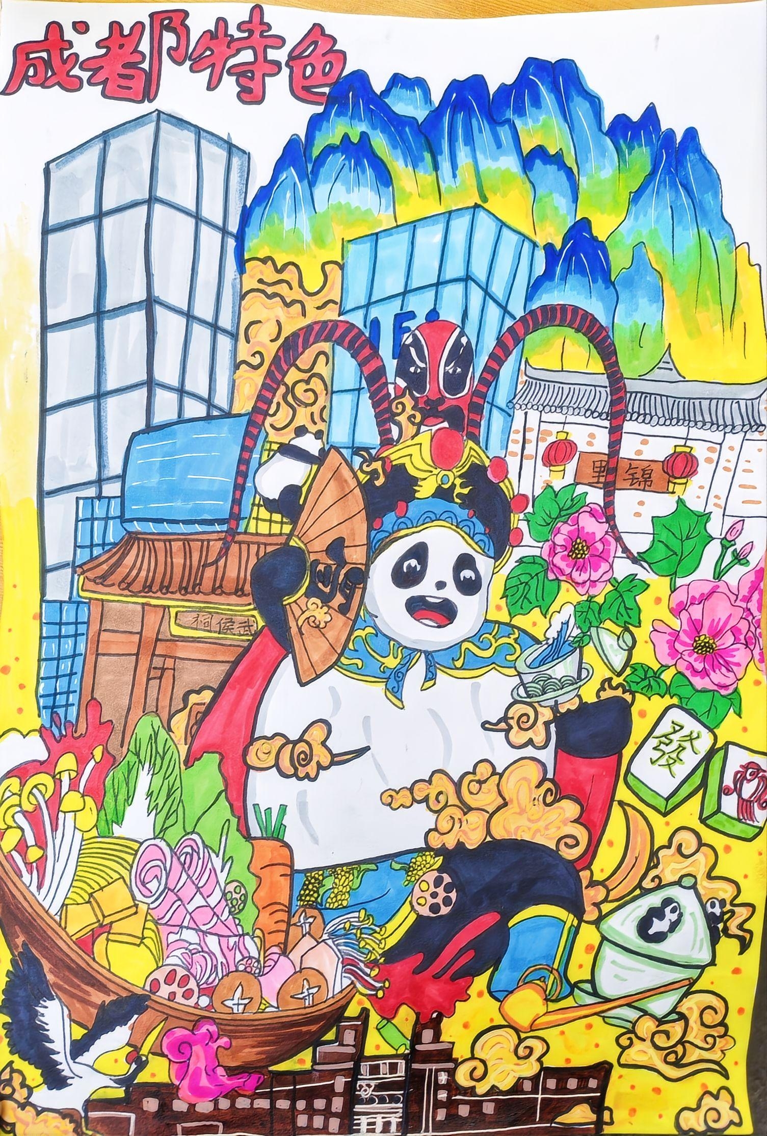 这幅作品以"成都特色"为主题,借多元元素展现城市魅力。核心是扮作川剧形象的熊猫,作为成都文化符号,串联起传统与现代。背景中,锦里、武侯祠等古建筑承载历史底蕴,现代高楼彰显城市活力,二者交织体现成都兼容并蓄。满载食材的容器呼应"美食之都",麻将、芙蓉花等元素,从休闲与市花角度丰富印象。以鲜艳色彩、丰富图案,构建热闹且有层次的视觉效果,传递成都传统与现代共生、人文与自然交融的独特韵味,让观者感受其烟火气与文化魅力 。