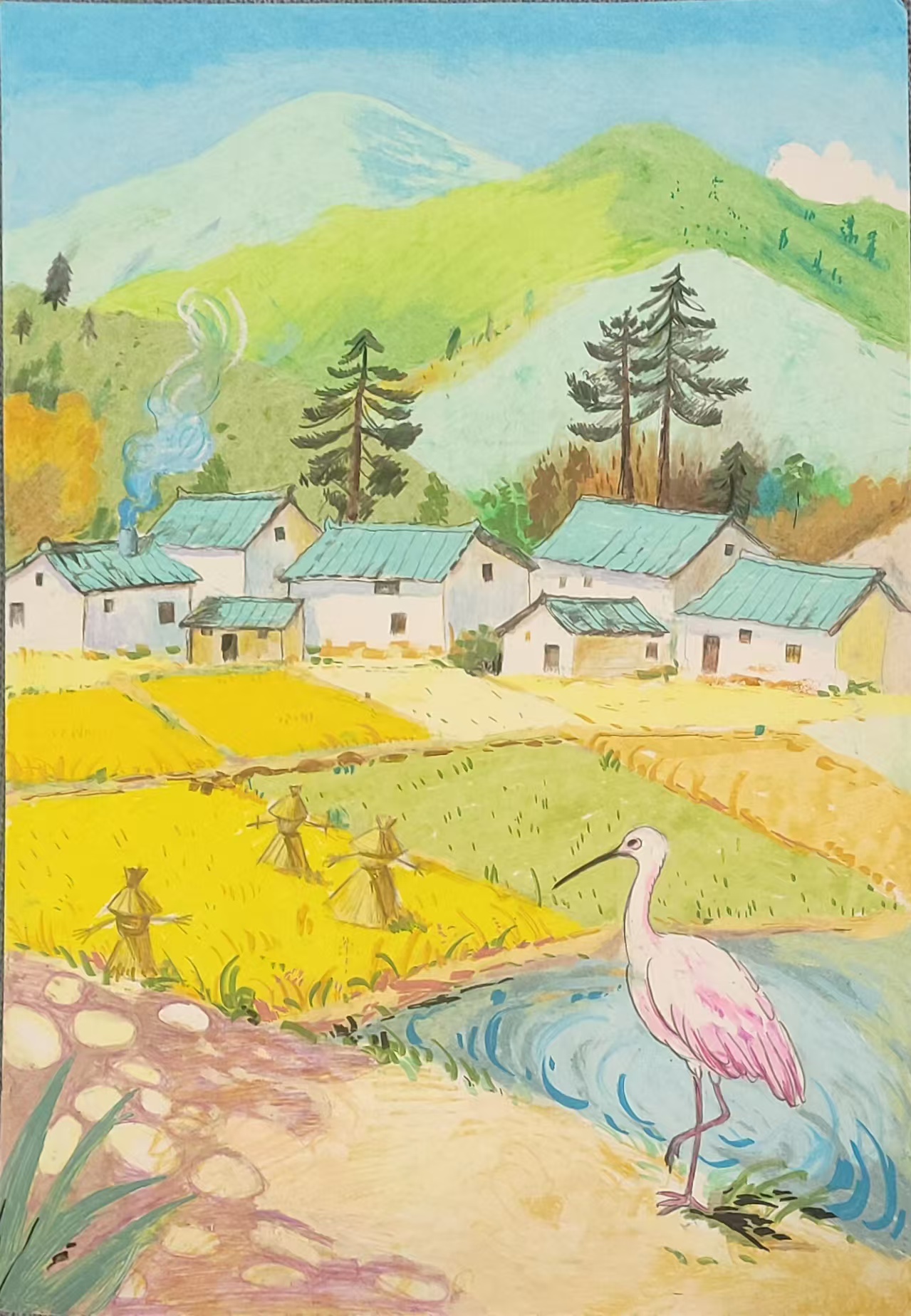 宁陕鱼湾村的景致格外动人:远山如翠玉连绵,白墙青瓦的民宿散落在绿意里,淡蓝炊烟悠悠飘向天际,与白云相映成趣。金黄稻田铺展在村边,稻草人静静立着,见证着即将到来的丰收。溪水清澈见底,一只朱鹮单足立于清波,羽毛在阳光下亮得耀眼。 这些鲜活的元素汇聚在一起,没有刻意的雕琢,却像一幅自然天成的画卷。青山、稻田、民宿与朱鹮,共同营造出乡村独有的宁静与和谐。