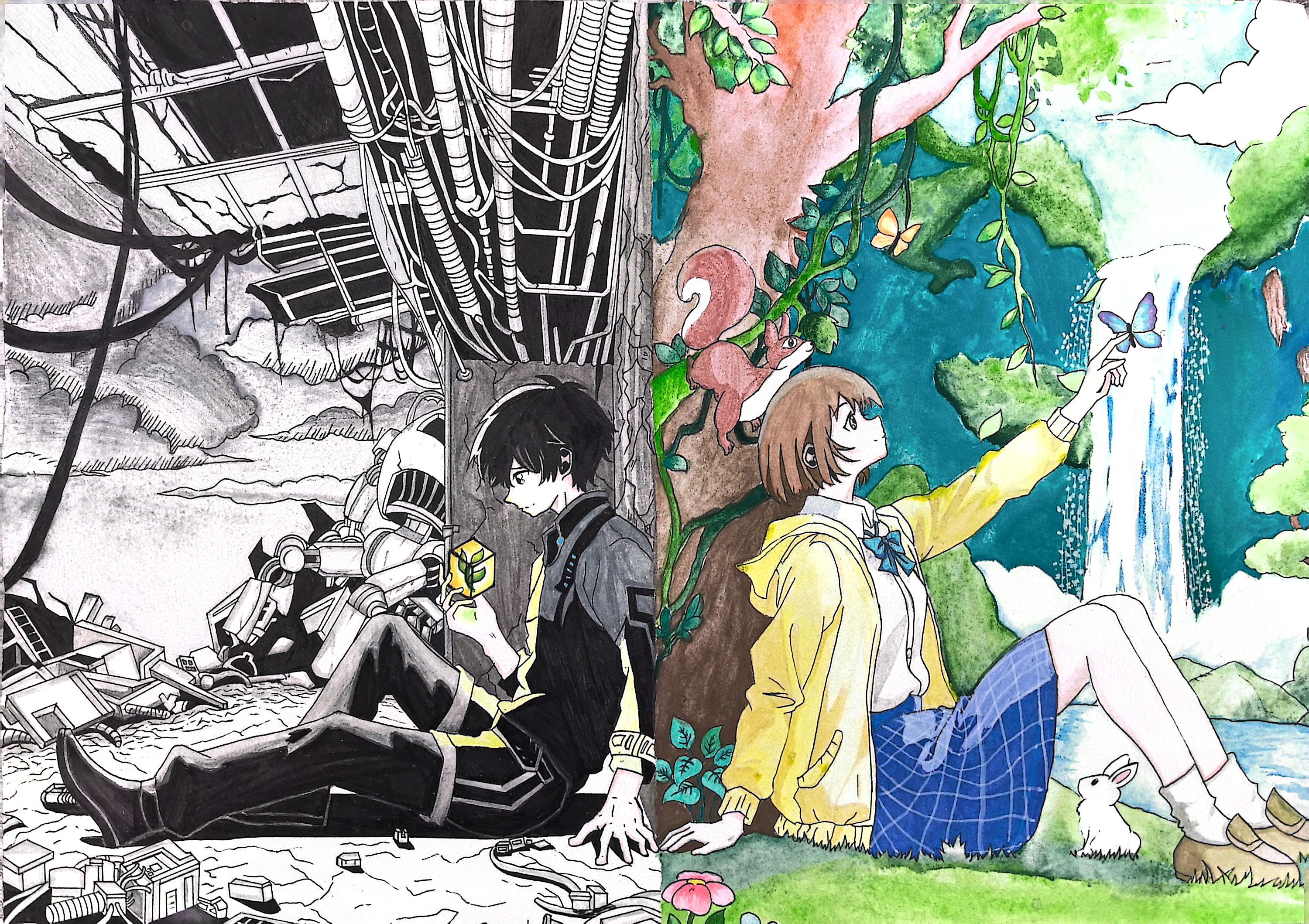 伊寻的由来,是无数个巧合与必然的结果。 当美术老师给我们欣赏往届得奖作品时,我发现很多以"生态环境"为主题的画作都画的是灾难、末日之景。为何不向往美好呢?我暗自作想。然而美术老师接下来的话启发了我:"其实关于自然,不是必须往坏的方面画,也可以画好的一面啊!"好与坏能否画成对立呢?瞬间,我想起了以前看到过的一期漫画封面,内容是从前未觉醒的主角与现在已觉醒的主角相视而望,环境、身份、力量的改变却没改变他的心。于是我决定围绕"生态环境"画一副好坏参半的画作,其中既有身处逆境对希望的向往,又有已知光明对希望的珍惜。