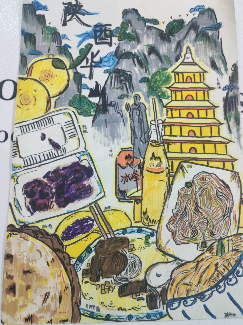 主要内容:我本次绘画作品是以陕西美食为主,主要特色为陕西肉夹馍以及陕西凉皮,同时还有甄糕、冰峰等陕西特有的食物。后面还添加了大雁塔、华山,将当地美食以及特色建筑相结合,充分体现了陕西的美。 页面布局:我在本次绘画当中将华山做为背景,前面则是陕西的特色美食,还插入了大雁塔及佛像等元素,且颜色十分丰富,使画面富有色彩,这也是层次绘画的特色。 以上为本次绘画的主要创作大纲。