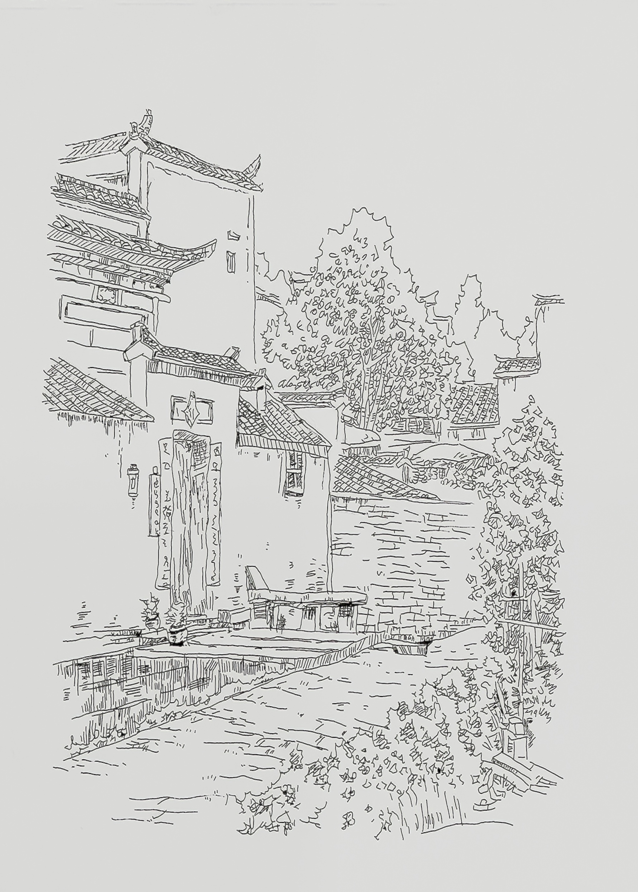 这幅线描作品以农村古村落的巷弄为载体,用极简的黑白线条勾勒"乡村建筑肌理——错落的马头墙、斑驳的石墙、挂着楹联的门楼,都是古村岁月的具象符号。石阶旁的盆栽、墙边的石凳,藏着村民闲谈的余温;枝叶掩映的屋角,是自然与古建的温柔共生。