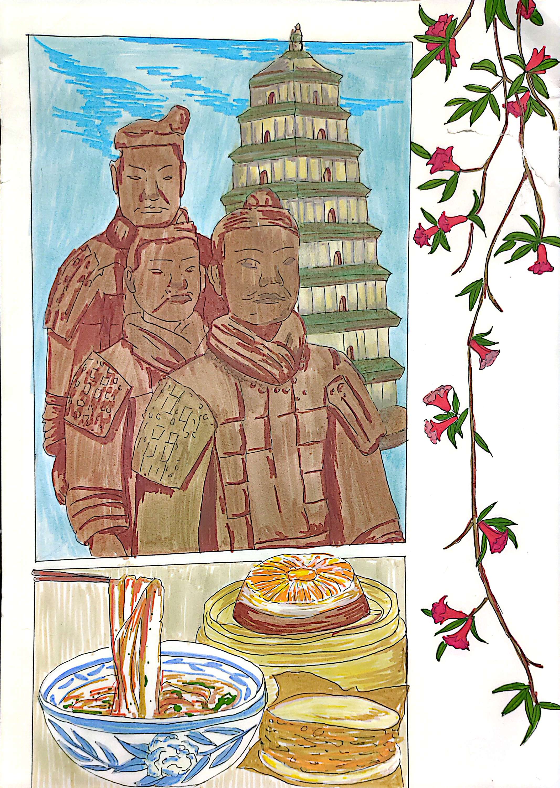 《古都的双面律动》 画面巧妙呈现西安的双面相融,大雁塔与兵马俑彰显历史底蕴,是时光沉淀的厚重底色;花枝与美食勾勒生活烟火,为古都注入鲜活温度。二者交织,如城市的双面律动,让古老西安在历史传承与当下烟火中,展现独特且迷人的气质,诉说专属西安的故事 。
