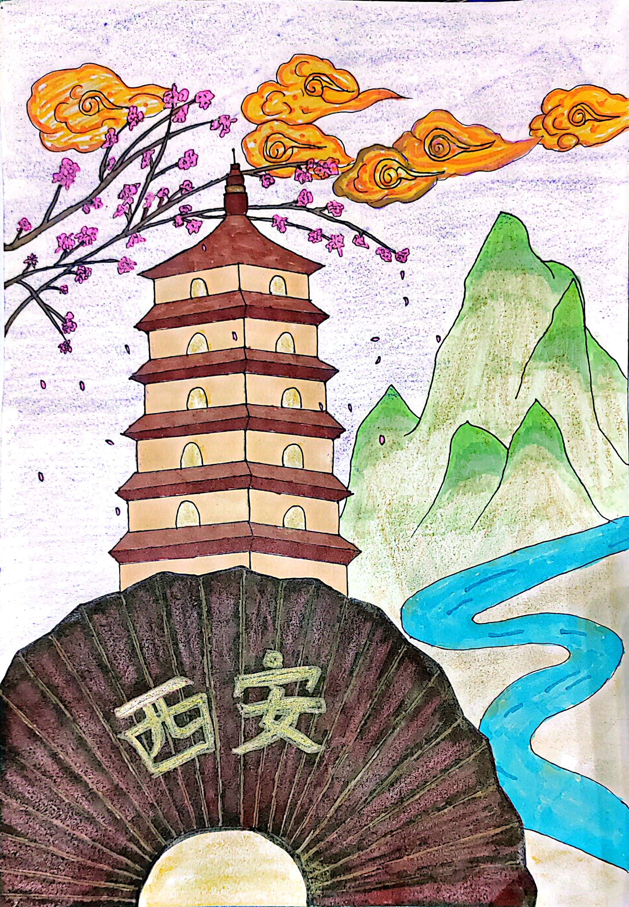 《扇启长安盛景》 这幅画以折扇为引,"西安" 二字开启古都画卷。古朴宝塔矗立,繁花与彩云点缀天际,青绿山水、蜿蜒河流环抱,将西安的历史厚重与诗意风景相融,用童真笔触勾勒出长安盛景,传递对这座城市古韵与美的赞颂 。