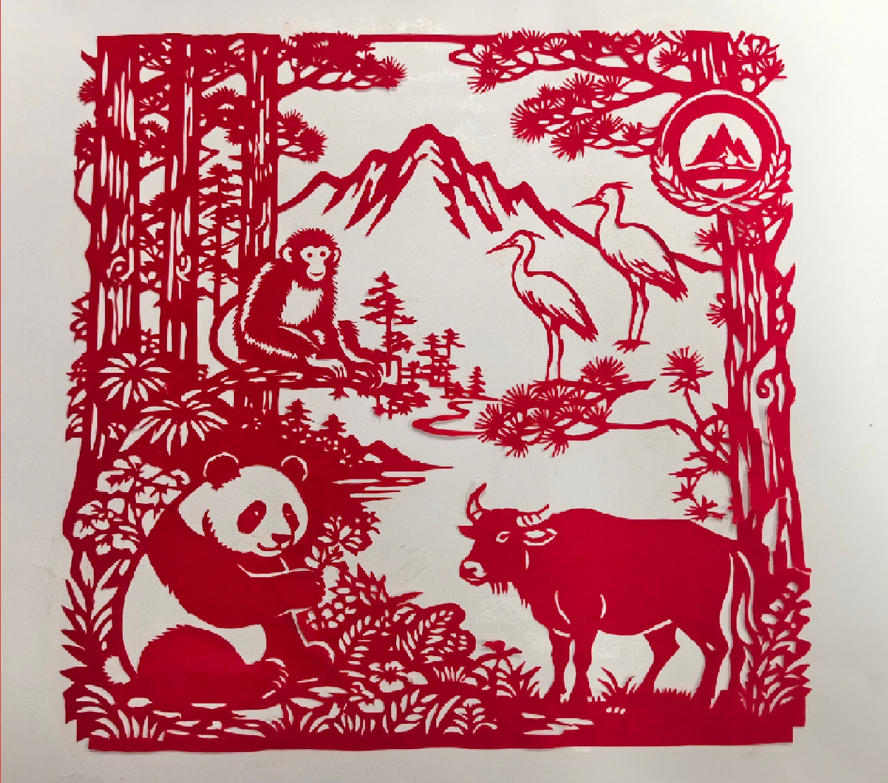 这幅剪纸以中国传统朱红为底,以秦岭生态为核,借刀刻镂空之法,织就一方生灵共栖的秘境:苍松挺秀间,熊猫憨坐衔竹,金丝猴踞枝凝睇,羚牛稳踏芳丛,白鹭临水梳羽,远山如黛、溪涧蜿蜒,草木的纹理与生灵的轮廓在虚实间相映成趣。右上角"秦岭保护"的徽记,暗契作品内核——以剪纸这一非遗语言,凝萃秦岭的生物多样性之美,既显传统技艺的精工韵致,亦藏对自然共生的诗意咏叹,于方寸红纸间,铺展生态家园的鲜活与静美。