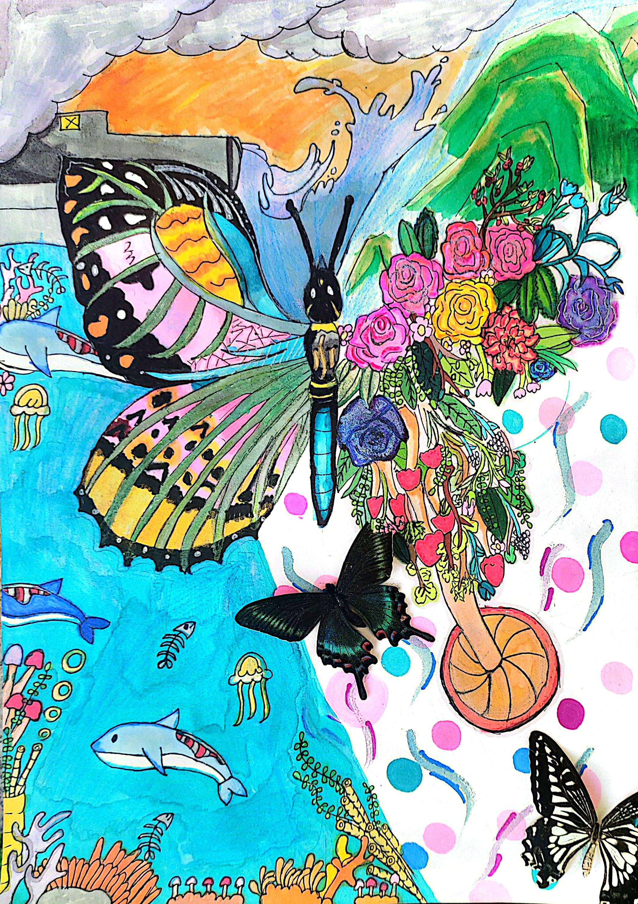 《蝶梦奇旅》这幅画是一场奇幻的视觉漫游。色彩斑斓的蝴蝶化身为灵动主角,翅膀融合多种绚丽色调,如打翻的调色盘,一侧托着繁花束,将浪漫与生机传递;另一侧连接海洋世界,海豚穿梭、水母漂浮,构建出奇妙跨界场景。背景中,天空与山峦的色彩碰撞,增添梦幻氛围。大小蝴蝶点缀,似在呼应这场奇旅,每处细节都在诉说突破边界的想象,把自然元素肆意交织,带你踏入无拘无束的梦幻天地,感受艺术与创意碰撞出的奇妙火花 。