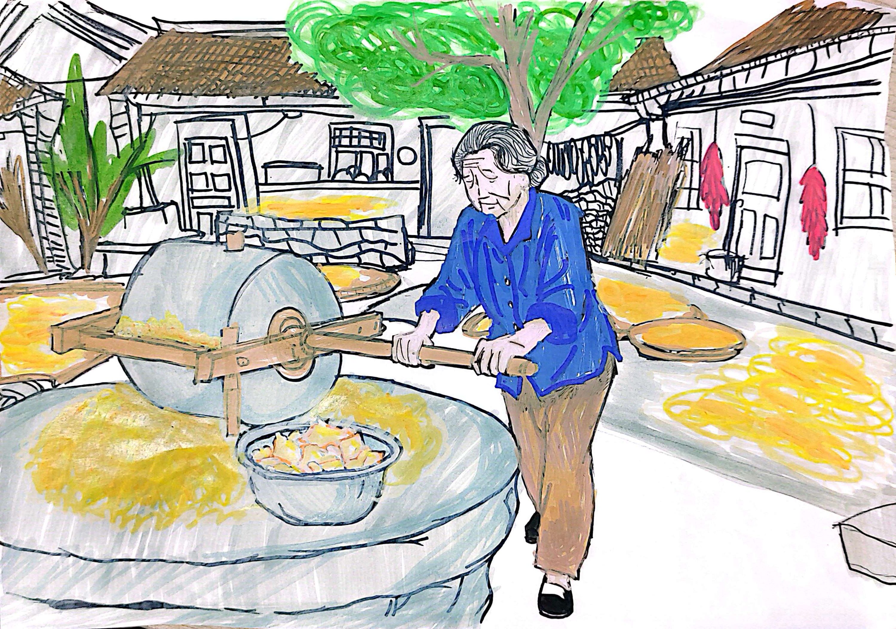 这幅画定格乡村日常,老奶奶推石磨的身影,满溢岁月温度。老旧石磨、金黄作物,搭配古朴院落与绿植,勾勒出故乡独有的烟火气。色彩与线条间,藏着对传统农耕生活的眷恋,唤起人们心底关于乡土、关于长辈的温暖记忆 。