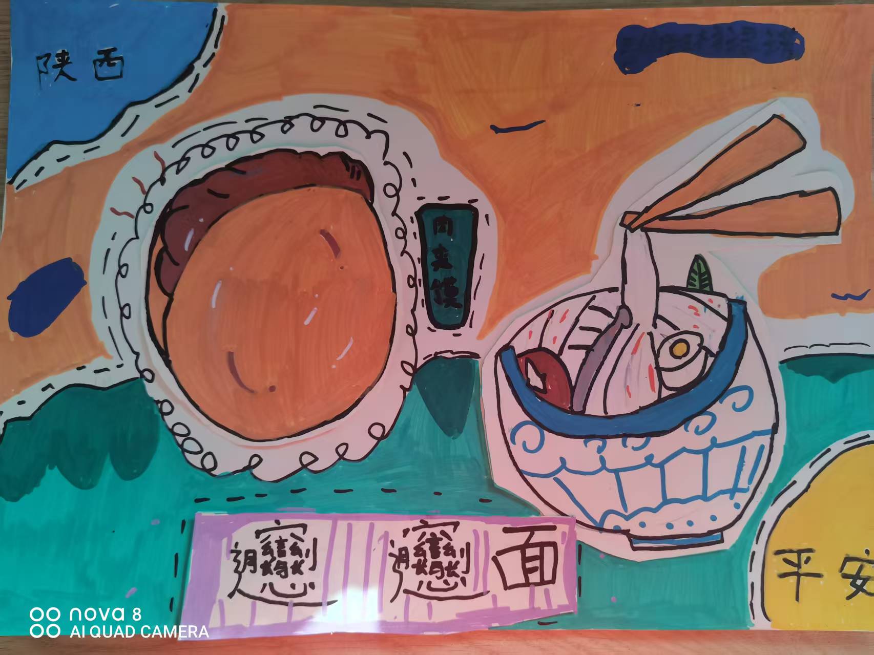 这幅画以陕西美食为主题,用明快的色彩和立体拼贴感,把油泼面、肉夹馍、凉皮这些 "老陕味道" 变成了活泼的画面。 我想用童趣的笔触,把食物画得像在 "冒热气"—— 大碗里的面条裹着红油,馍馍的纹路带着烟火气,凉皮的透亮感里藏着夏天的清爽。左上角的 "陕西" 和右下角的 "平安",是想让家乡味道和温暖心意一起 "上桌",让看画的人能从色彩里尝到陕西的热闹与踏实。
