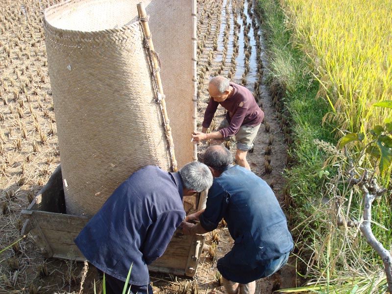 爷爷们用一个办桶和一部簟子,把簟子卷着插入桶中为了挡住谷了落到外面去,然后拿起先前已割好的谷葩子用力的在桶口上摔打,这样所有的谷子就会落入桶中。