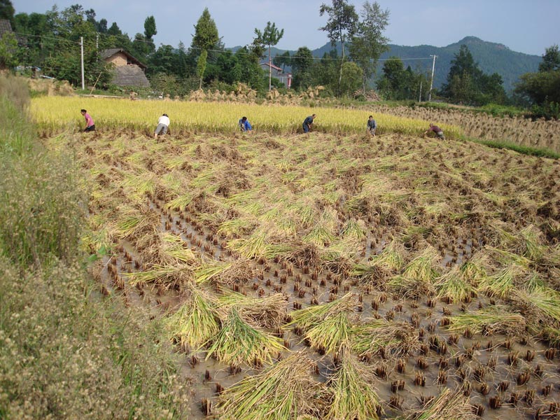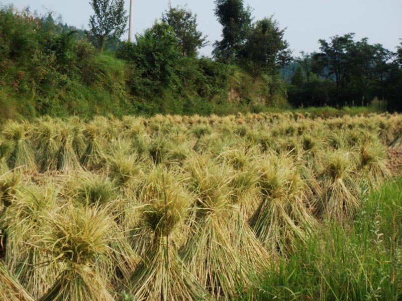 第二天,邻居们齐聚我家来帮助我们收割谷子。首先是用镰刀从谷子的底部割起,并一把一把的整齐的排放好。