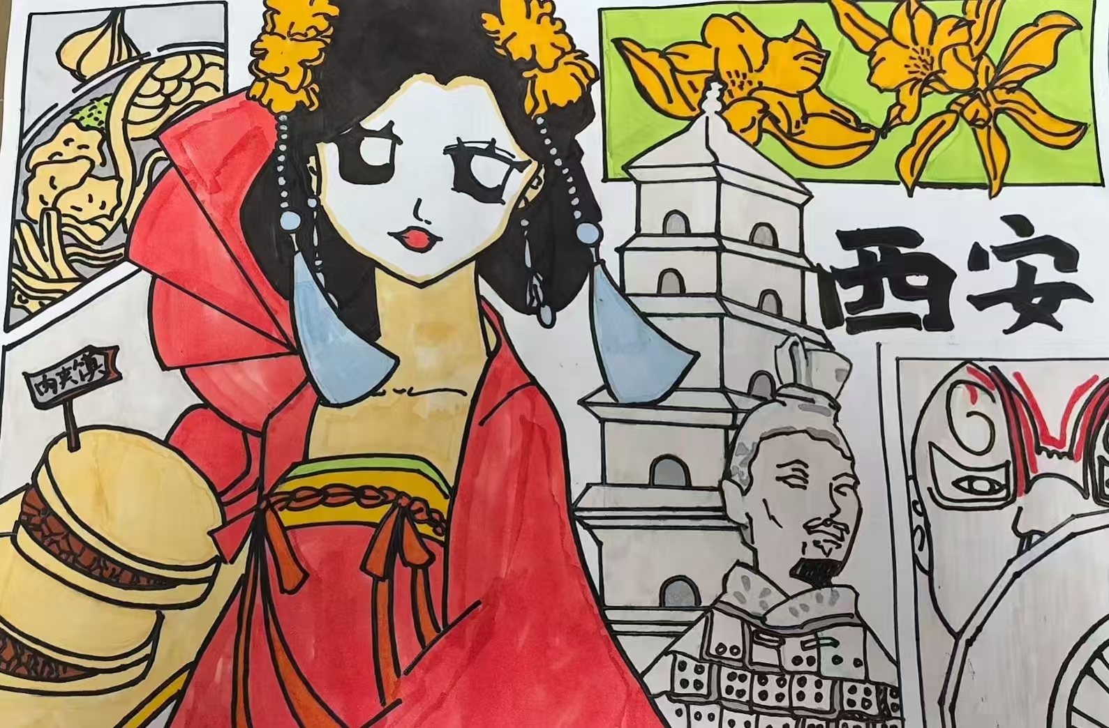 我以 "古今共栖的长安心跳" 为核心理念创作这幅画:让盛唐的石榴花簪落在少女鬓边,将唐装的红与肉夹馍的暖捏成烟火气,让大雁塔的檐角、兵马俑的甲片与皮影的轮廓,在同一帧里成为 "过去" 的注脚。 我想让历史不是陈列的标本,而是会呼吸的温度 —— 石榴花是千年未散的香,肉夹馍是代代相传的暖,少女是长安的眼睛,正看着旧砖瓦里长出新的灯火,让西安的古今在画里轻轻撞了个满怀。