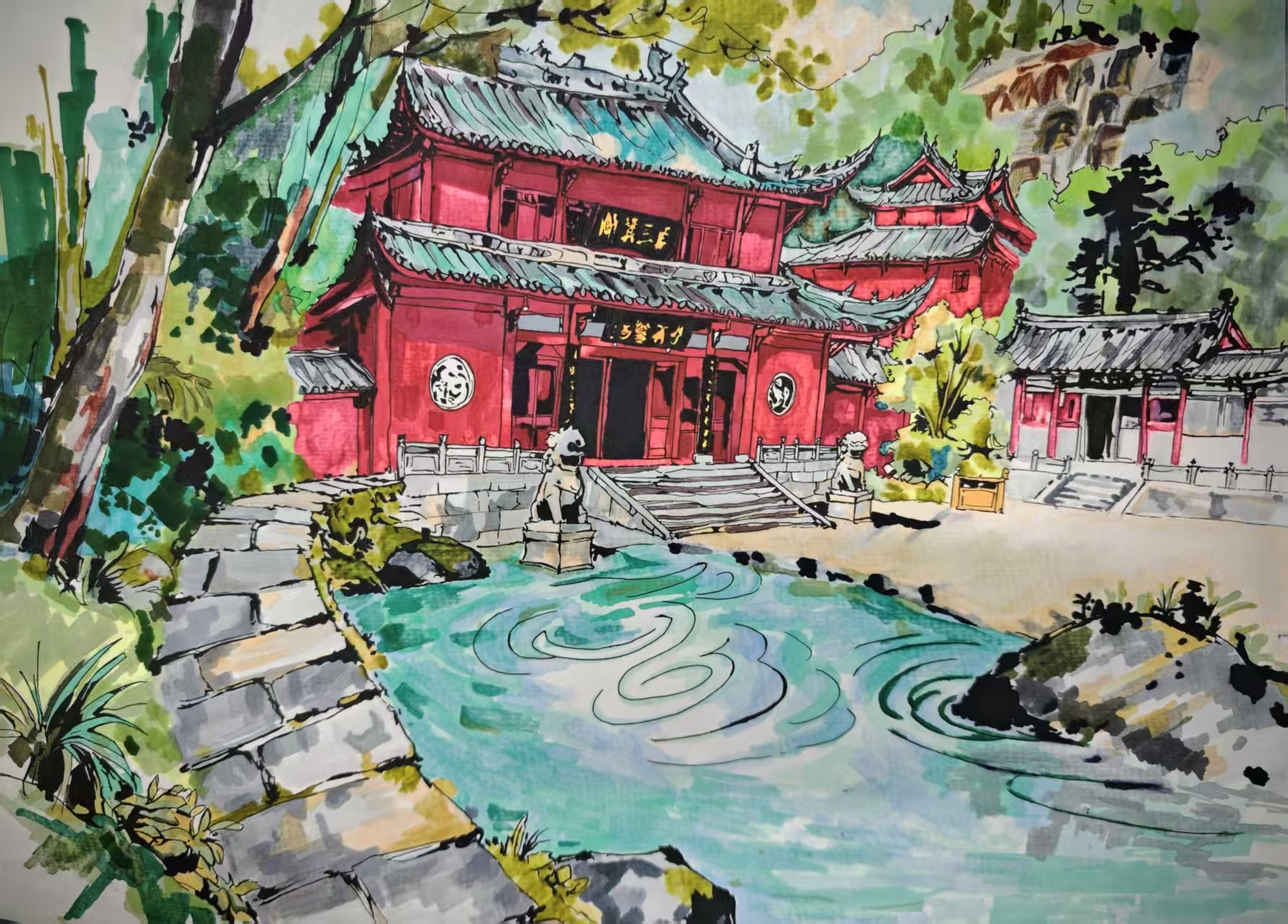 建筑依嘉陵江畔的崖势而筑,旁侧碧水泛波、石墙与叠翠草木环伺,恰是皇泽寺"寺在崖上、景融江川"的地理特质。洒脱的墨彩笔触里,既见古建群落的庄重肌理,也晕染出这座武则天祀庙"红檐映溪、翠色围合"的灵秀意境,把千年寺宇的文脉与山水意趣凝于画间。