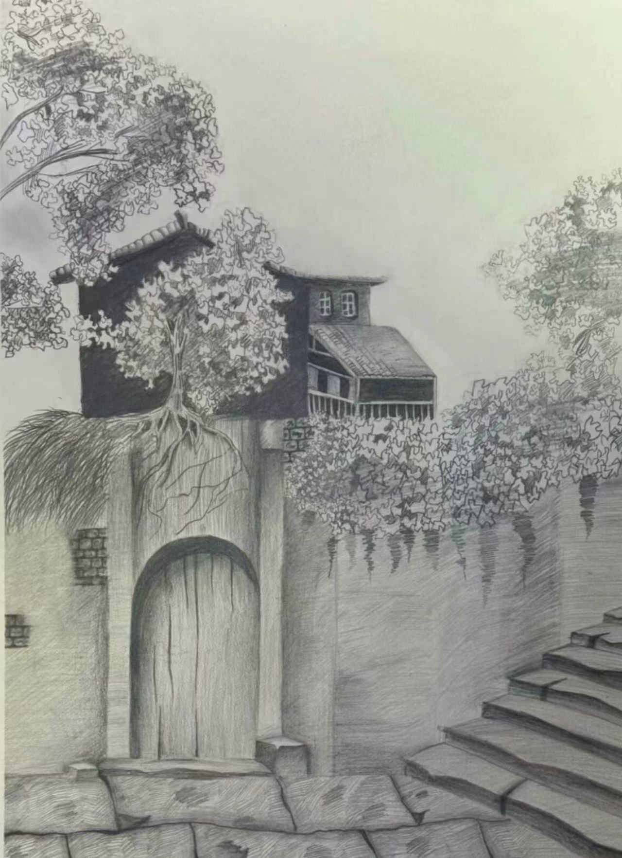 大家好!这是我画的《龙吟古村・树屋乡居》,是咱们龙吟这儿的老村子哦!你看房子旁边的大树长得多好,老房子和树挨在一起,这是咱们这儿独有的样子~现在这儿是生态旅游点,来玩能看老房子、摸大树根,还能听叔叔阿姨讲怎么保护这些老树和古村。大家都很爱护这儿,不让树和房子受伤,这样咱们才能一直看到这么美的景色!快来龙吟古村玩吧,又能看特别的老房子,又能和大树做朋友~