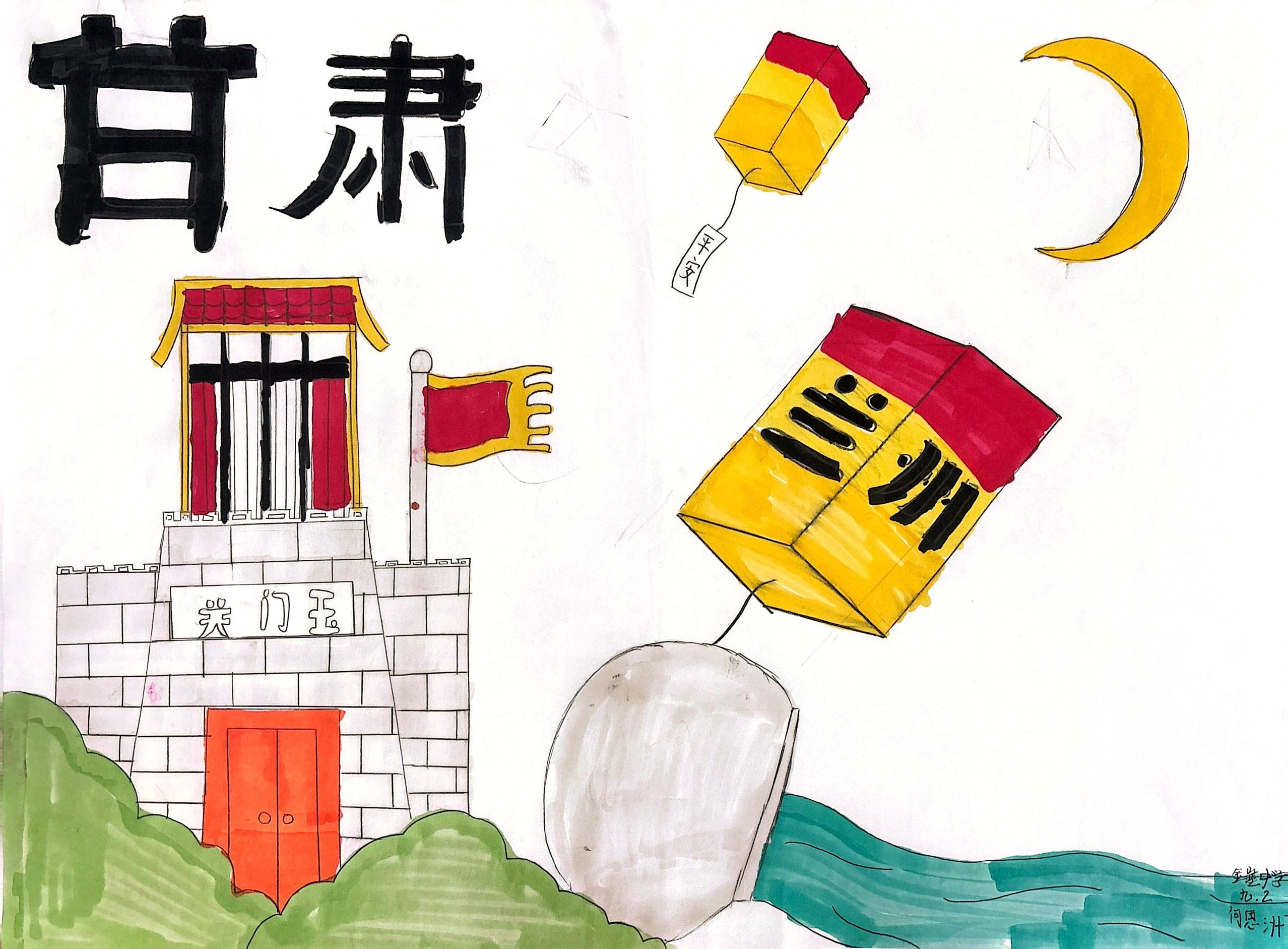 这幅作品以"甘肃的符号轻语"为核心,用童趣化的视觉语言串联地域标识:玉门关城楼锚定甘肃的丝路历史根脉,写着"兰州"的孔明灯则勾连省会的当代烟火,"甘肃"题字与星月为画面定下地域与氛围基调。 色彩上以鲜明的红黄蓝为主,既贴合玉门关的厚重、孔明灯的温暖,又以童趣笔触消解历史的肃穆感,让"古老关城"与"轻盈灯火"在画面里形成"厚重与鲜活"的对话。 创作意图是"以小见大":借玉门关、兰州孔明灯这些浓缩的符号,把甘肃的历史底蕴与生活温度揉进简洁的画面,让观者从这些轻盈的意象里,感知甘肃"藏着千年故事,也飘着日常暖意"的独特气质——它不只是遥远的丝路古道,更是烟火与岁月共生的鲜活土地。