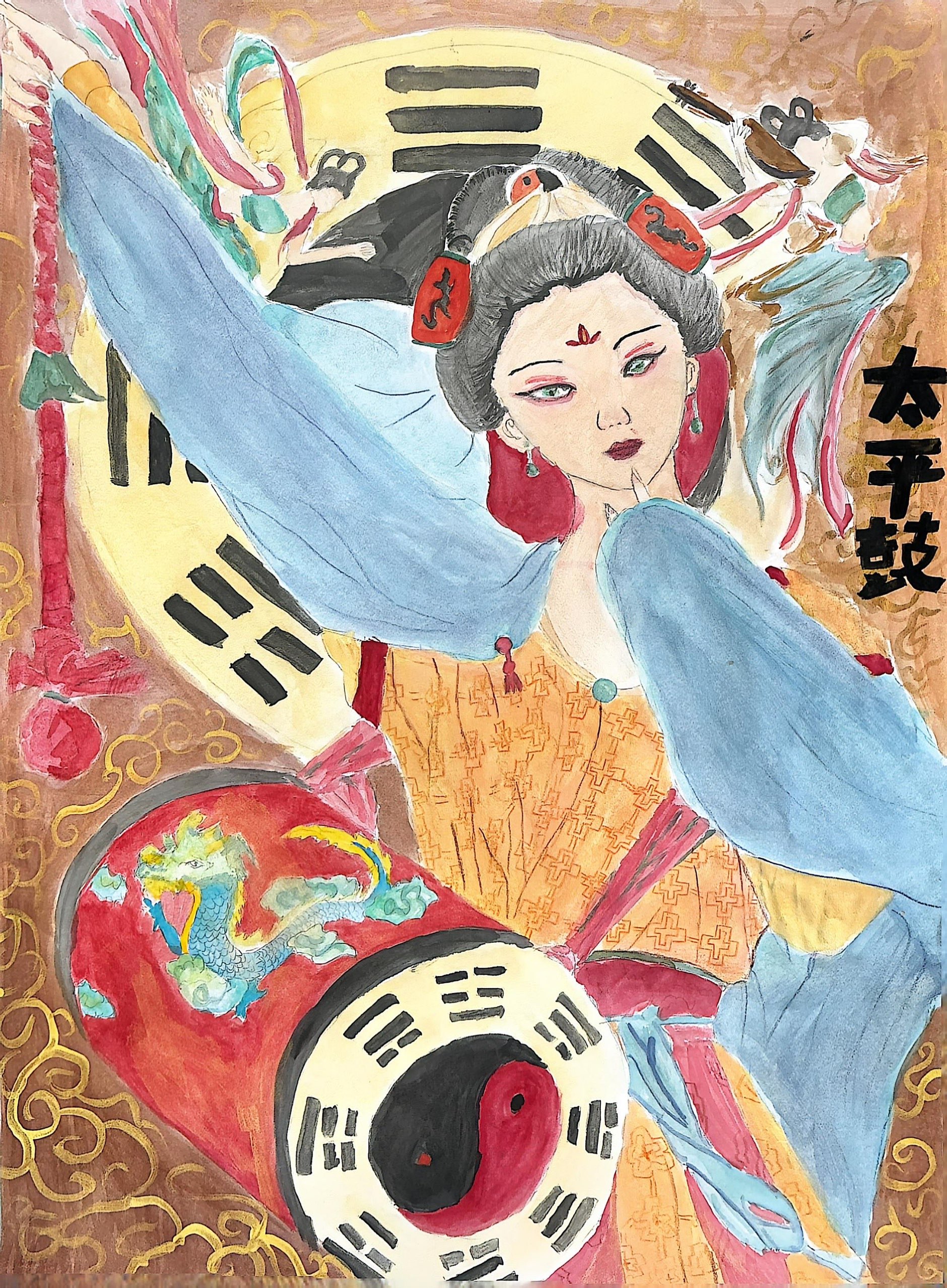 这幅作品以"太平鼓里的文化叠韵"为核心,将甘肃非遗"太平鼓"与传统符号交织:鼓身的太极、八卦纹承载着中式哲学的韵律,鼓面的祥龙呼应着民俗的祥瑞意象,而唐代仕女的飘逸衣袂与飞天元素,则揉入了敦煌艺术的灵动气质。 暖棕底色衬着金黄缠枝纹,复刻了传统器物的华贵质感;仕女的蓝袖、红饰与鼓身的红黑撞色,既保留民俗艺术的浓烈色彩,又以仕女的柔美消解鼓的刚劲,让"非遗乐器"哲学符号"敦煌艺术"在画面里共生。 太平鼓本是甘肃民俗里的热闹符号,借太极、飞天等元素,让它跳出"表演乐器"的身份,成为文化的容器——既藏着民俗的烟火,又裹着哲学的深韵,还浸着敦煌的艺术魂。
