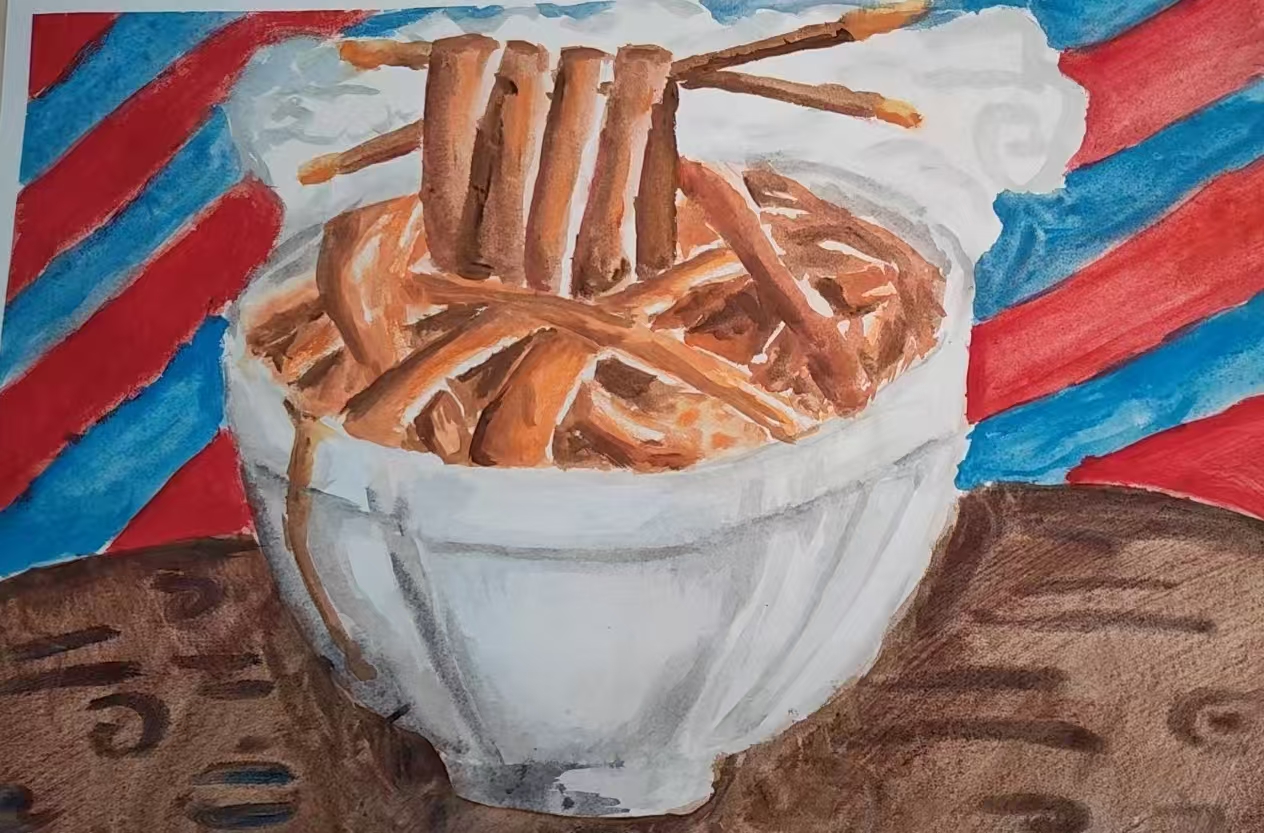 我想把陕西裤带面里 "粗粝又滚烫" 的魂抓进画里:宽宽的面条像关中汉子的性子,扎实又带着麦香的暖;白瓷碗是家里常用的老物件,盛着从小到大的踏实。背景红蓝斜块不是随意的撞色,是油泼辣子的红和醋香的清冽在碗里 "跳荡",也是吃面时鼻尖冒汗、心里发暖的鲜活劲儿 —— 这碗面不只是食物,是刻在骨里的故乡心跳,想用画笔让评委看见 "一碗面里的关中烟火"。
