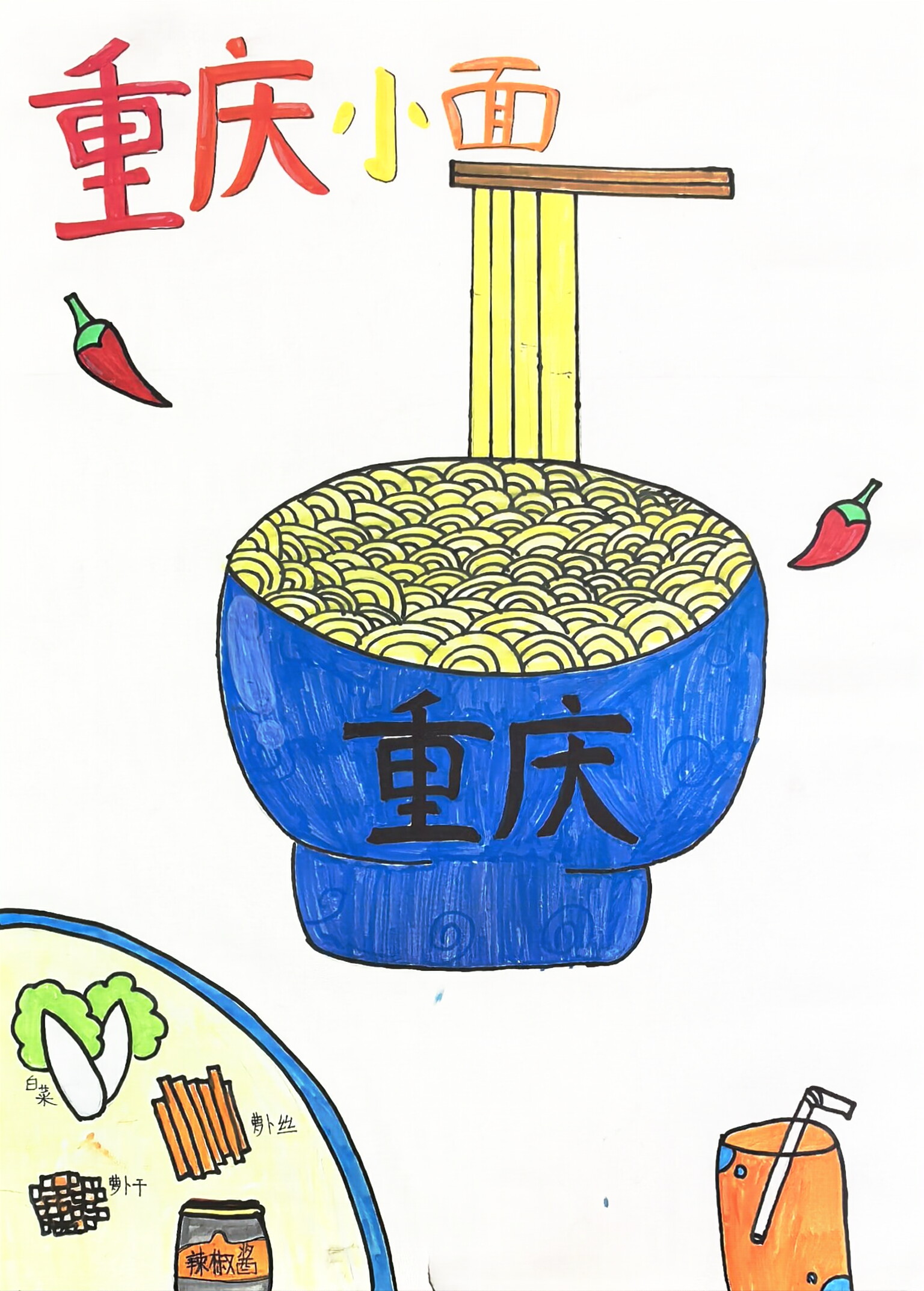 大家好!这是我画的《重庆小面・山城味旅》~ 重庆小面可是当地超有名的特色美食!来重庆旅游,除了看洪崖洞、逛山城步道,一定要尝尝这麻辣鲜香的小面 —— 面是本地做的,配菜也是新鲜的本地菜哦。咱们吃美食的时候不浪费,吃完把垃圾扔对地方,也是爱护山城环境的小办法!快来重庆逛美景、吃小面,一起感受这座城市的热闹和美味吧!