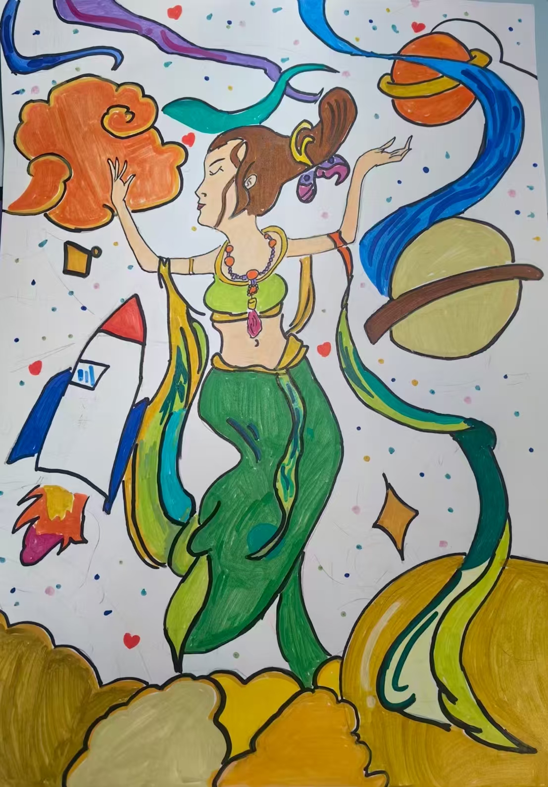 这幅画以《飞天赴星海》为名,核心是让 "敦煌飞天" 的传统浪漫,和 "探索星海" 的现代科幻完成一场温柔的拥抱。 我把壁画里舞带飞天的身姿,和能游向宇宙的鱼尾结合 —— 飞天的飘带不再只绕着云,而是缠向星球;手中的暖光云团,是想把敦煌壁画里的温度,变成能暖亮星海的光。 加入小火箭,是让古人 "飞天" 的幻想,和今天的航天梦在画里呼应,让传统里的浪漫,长出触碰星辰的勇气,让看画的人能在画里看见:千年的梦,正在跟着飘带飞向星海。