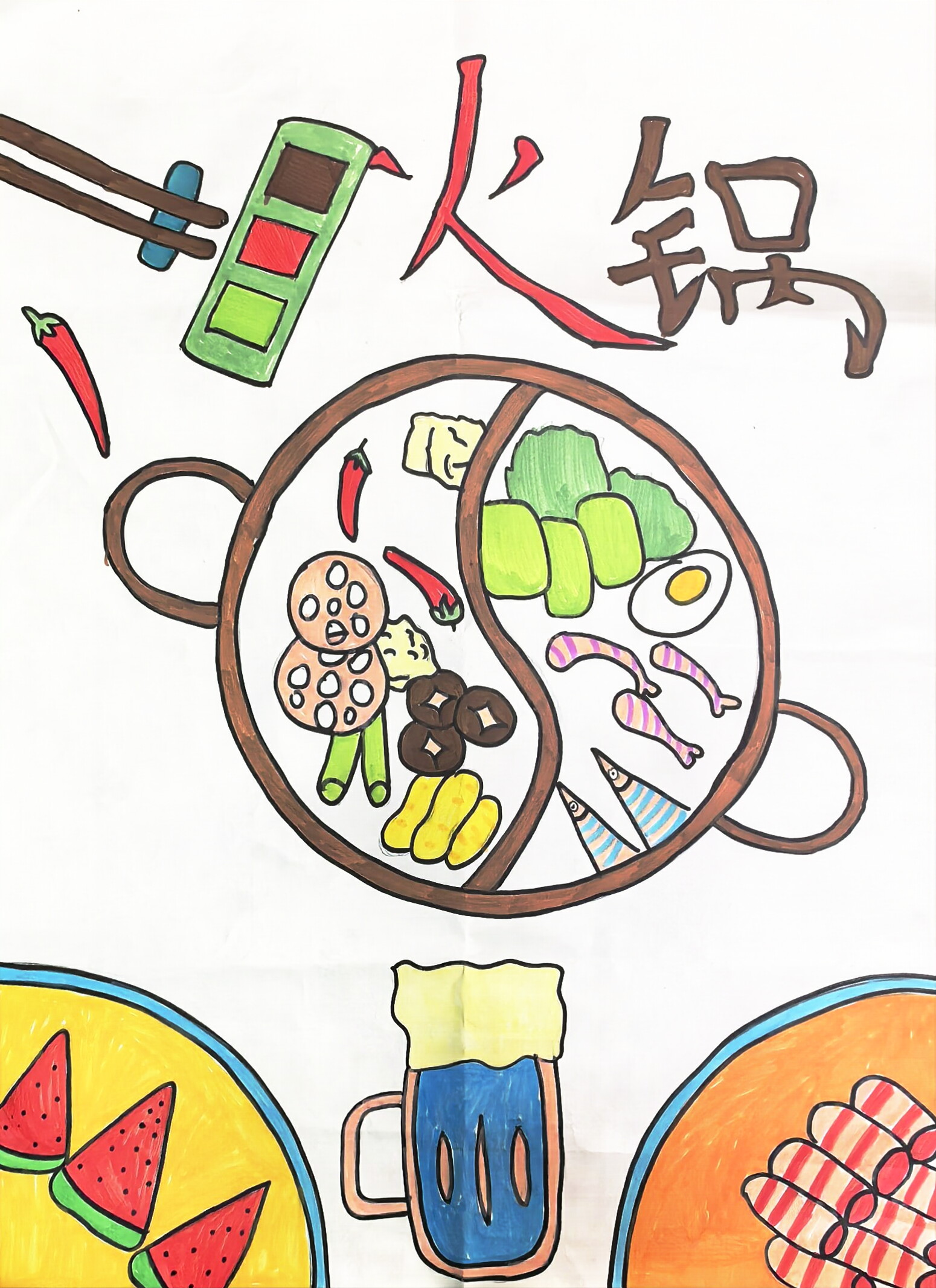 大家好!这是我画的《重庆鸳鸯锅・山城味游》~ 鸳鸯锅可是重庆超有名的特色美食!来重庆旅游,逛完解放碑、看完长江索道,坐下来吃顿麻辣鲜香的鸳鸯锅,配菜都是本地新鲜的生态食材哦。咱们吃的时候按需取菜不浪费,吃完把垃圾分类扔,就能一起爱护山城的好环境啦!快来重庆品特色火锅、赏山城美景,一起当快乐又环保的小游客吧!
