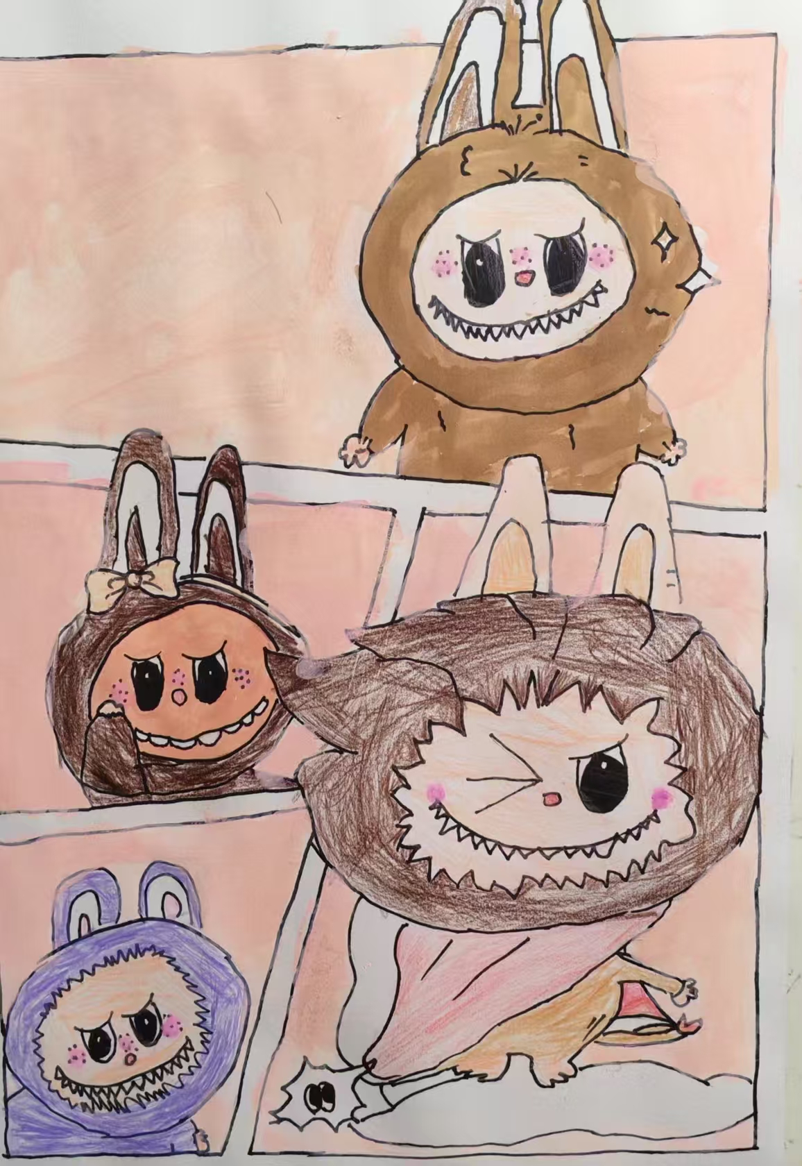 这幅画是想把 "戴着面具的小调皮" 装进漫画格子里:棕褐的兔子面具带着坏笑,粉扑扑的脸颊藏着恶作剧的小心思;格子里的渐变色彩,是想让这些 "戴着面具的可爱捣蛋鬼",像在玩一场躲猫猫 —— 面具下的尖牙不是吓人,是孩子式的 "装凶逗乐"。 我想用这种漫画式的分镜,把 "戴着面具偷偷做鬼脸" 的天真劲儿留住,让每一格的小表情,都带着能让人笑出声的、不加掩饰的淘气,告诉看画的人:最可爱的 "小坏",都藏在这些毛茸茸的面具里。