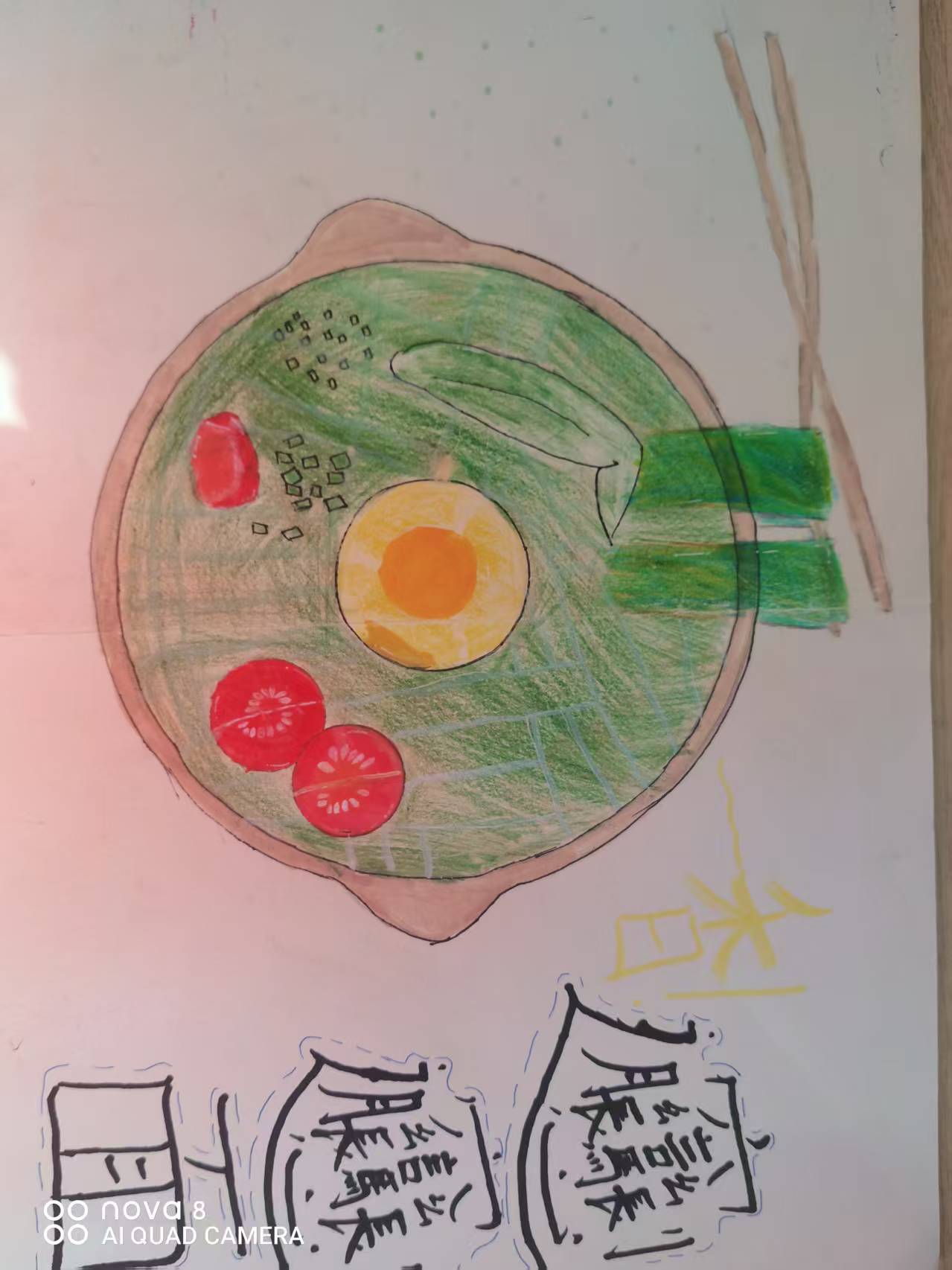 这幅画的创作,是想把 "一碗清淡汤面里的温柔" 揉进色彩里:青绿的汤底像把春天的嫩竹味装进碗里,溏心蛋的暖黄是藏在清淡里的甜,几颗红亮的小番茄像在汤里跳着的小欢喜。 旁边重复的 "香" 字,是想把面条蒸腾的热气变成看得见的味道 —— 我用软乎乎的笔触,让这碗面不只是食物,是清晨厨房里 "咕嘟" 冒热气的踏实,是能暖到胃里的、带着家常温度的香。