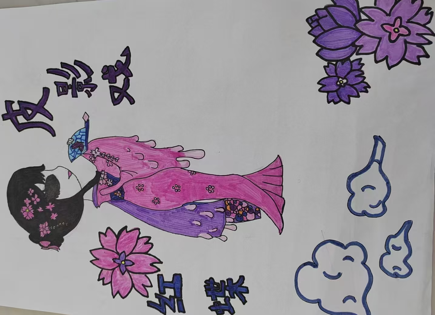 这幅画的创作,是想把皮影戏里 "隔着光影的温柔" 揉进色彩里:粉紫的皮影人带着绢花,裙摆像把戏台的软光裹在身上;旁边的云朵和莲花,是想让皮影不再只 "活" 在幕布后 —— 用透亮的线条勾出她的眉眼,让这些带着老戏台温度的色彩,变成能捧在手里的 "戏梦"。 我想留住皮影戏里 "灯影晃着,故事在布上流动" 的轻软感,让画里的每一片花瓣、每一缕裙角,都带着能让人想起老戏台锣鼓声的、慢下来的温柔。
