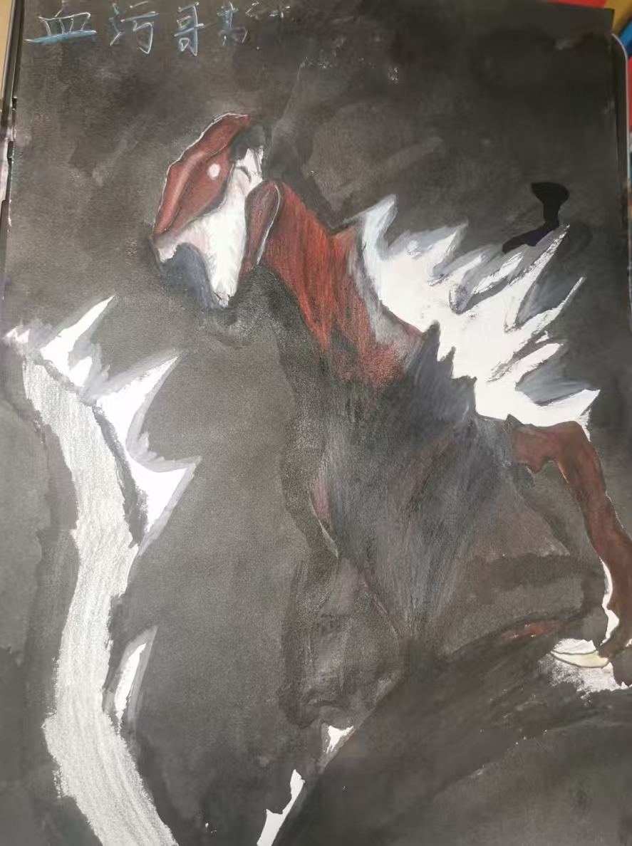 这幅画的创作,是想把 "奔马踏起尘雾的劲儿" 装进笔触里:深褐的底色是被马蹄扬起的土,赤白的色块是马鬃在风里炸开的红与白 —— 那些飞散的笔触不是乱,是把马奔跑时 "耳朵贴背、鬃毛抽风" 的野劲儿,揉进模糊的轮廓里。 我故意让画面带着 "看不清楚却能感觉到风" 的模糊感,是想留住奔马从眼前掠过时,那种 "只抓住一抹红、一道白,却满是冲劲儿" 的鲜活,让看画的人能摸到风里裹着的、马蹄砸在地上的震颤。