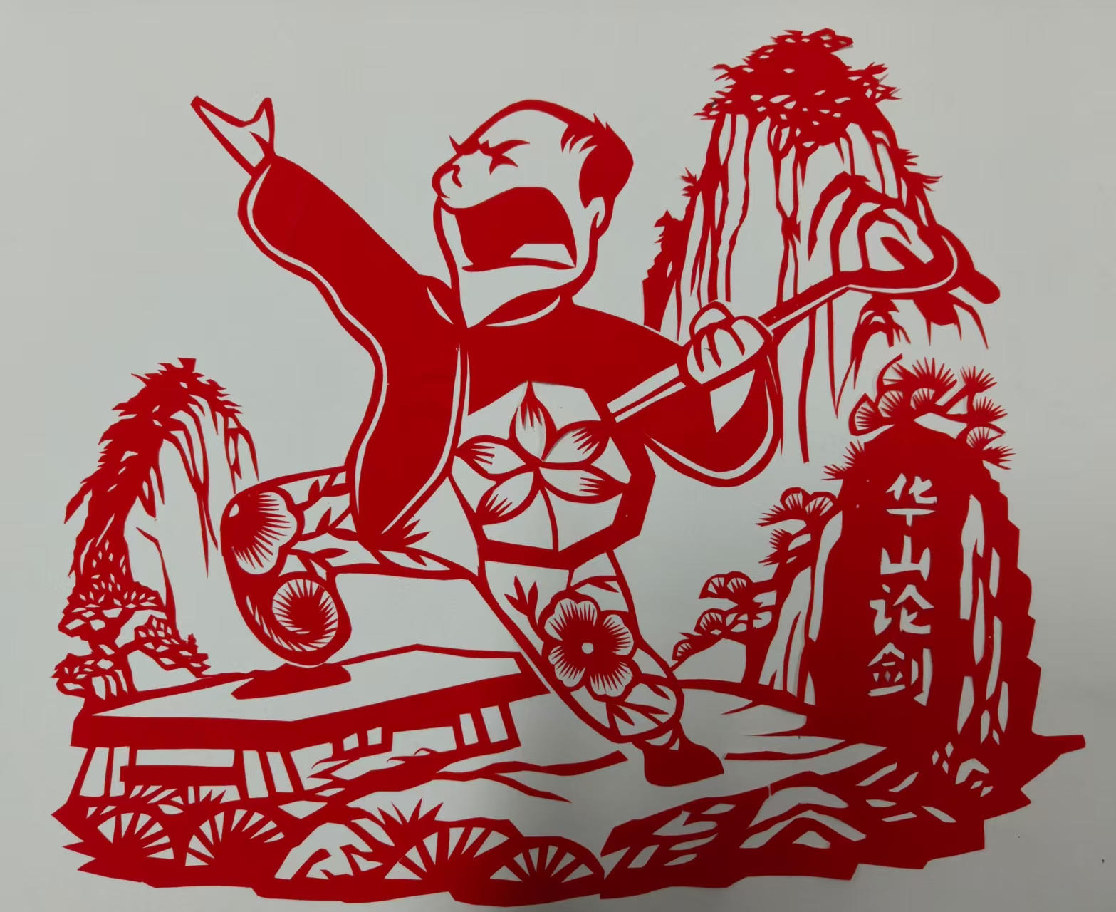 这幅剪纸的创作,是想把 "华山之巅吼老腔" 的粗粝劲儿,用红纸的锐感剪出来:人物张开的喉咙像把山风都吞进去,手里的梆子(或乐器)是敲在黄土里的响,背后华山的纹路是跟着唱腔 "抖" 起来的石棱。 我用剪纸的镂空花纹做衣上的花,让红里藏着软,和人物吼腔的硬撞出 "土生土长的热"—— 不是精致的细剪,是带着 "剪子划纸时的脆响" 的粗线条,让看的人能从红纸里,摸到老腔里裹着的、华山石头一样的扎实底气。