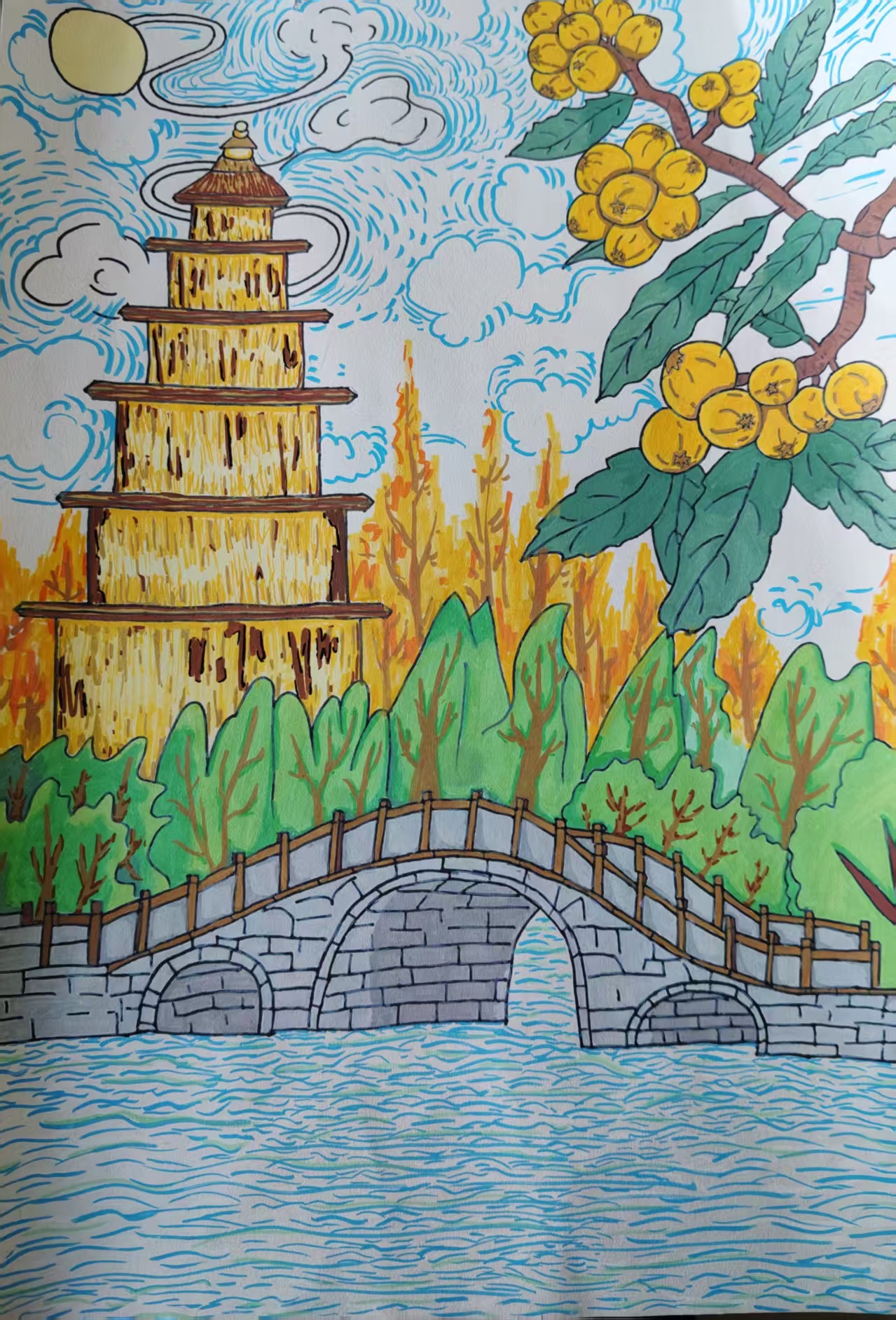 这幅作品以古塔、石拱桥、枇杷树为核心元素,勾勒出江南秋日的诗意景致。暖黄色的古塔矗立,石拱桥横跨波光粼粼的水面,枝头饱满的枇杷果实添缀生机,蓝白交织的云纹与水纹线条,让画面兼具灵动与韵律。整体以明快的色彩、层次分明的构图,融合建筑古韵与自然风物,传递出江南秋景的温婉与美好
